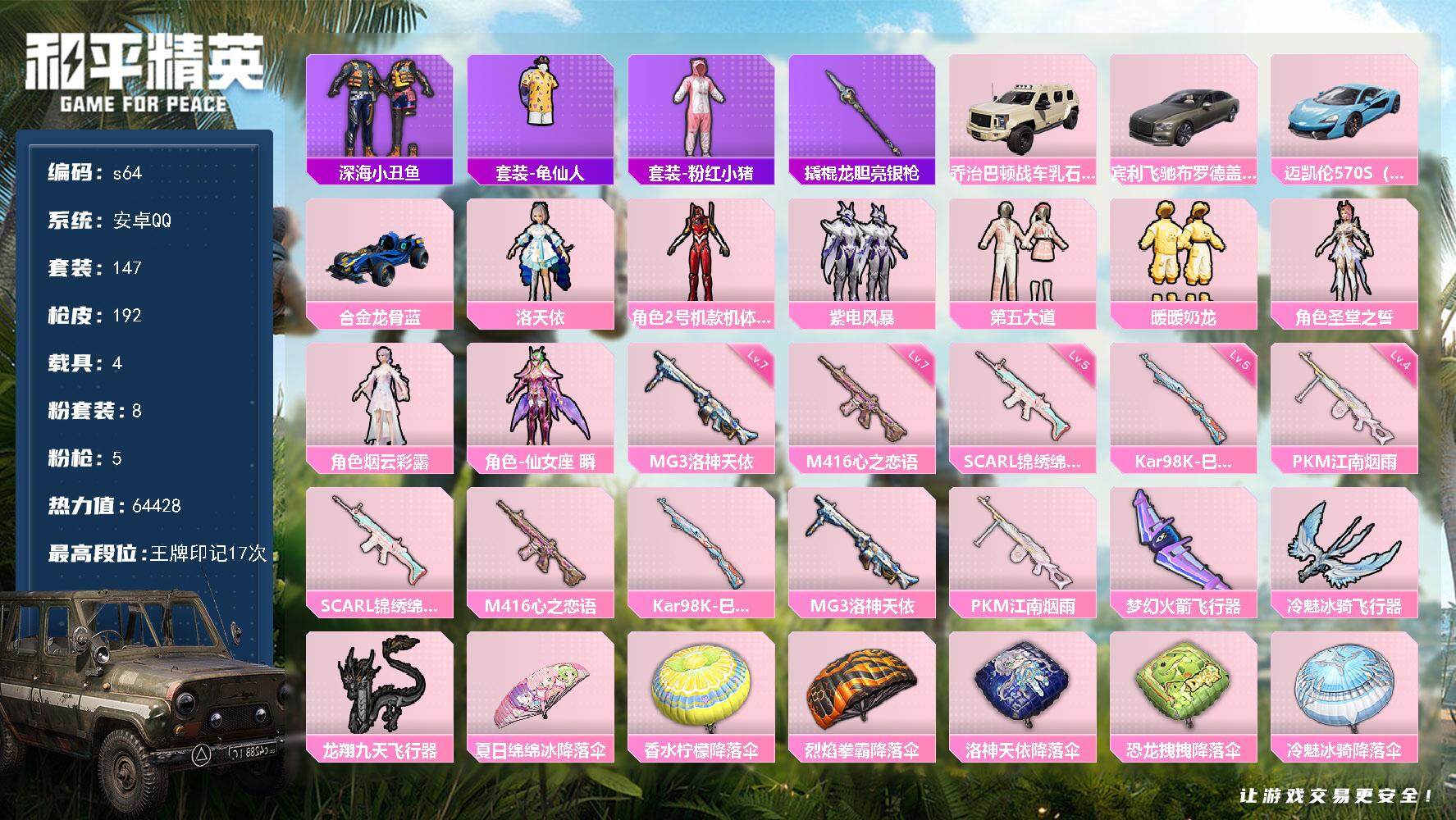 [13869417]安卓 手Q-8粉装-5特效枪-4载具-3粉色飞行器-64428热力值-17王牌印记-147套装-192枪皮