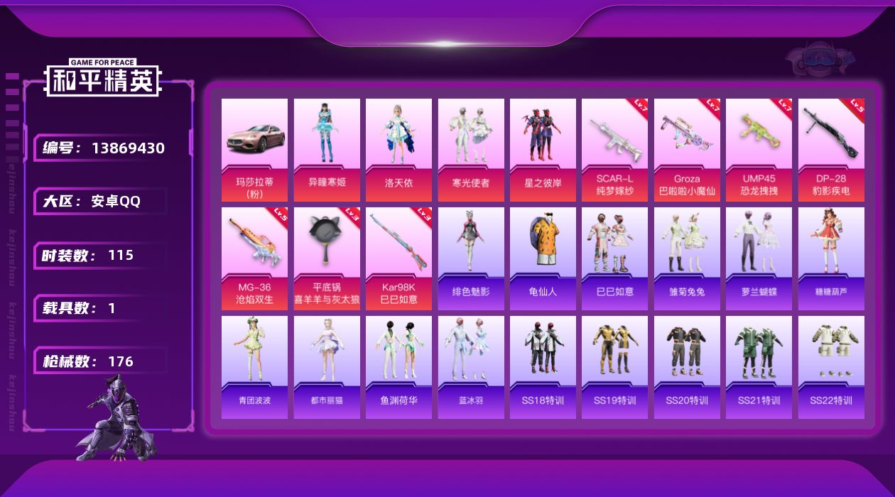 [13869430]安卓 手Q-4粉装-7特效枪-1载具-1粉色飞行器-56168热力值-13王牌印记-115套装-176枪皮 【热门品类】:套装-龟仙人 【粉色载具】:玛莎拉蒂Ghibli(粉) 【粉色套装】:粉装-星之彼岸,角色-洛天依,粉装-寒光使者,角色-异瞳寒姬 【粉色枪皮等级】:SCAR-L-纯梦嫁纱(七级),GROZA-巴啦啦小魔仙(七级),UMP45-恐龙拽拽(七级),Kar98K-巳巳如意(三级),DP-28-豹影疾电(五级),MG-36-沧焰双生(五级),平底锅-喜羊羊与灰太狼(三级) 【粉色枪皮】:SCAR-L-纯梦嫁纱,GROZA-巴啦啦小魔仙,UMP45-恐龙拽拽,Kar98K-巳巳如意,DP-28-豹影疾电,MG-36-沧焰双生,平底锅-喜羊羊与灰太狼 【粉色飞行器】:夏日绵绵冰飞行器 【粉色降落伞】:夏日绵绵冰降落伞,恐龙拽拽降落伞,第五大道降落伞,闲梦青缨降落伞,圣堂之誓降落伞,千金淑猫降落伞,盛世惊鸿降落伞,异瞳寒姬降落伞 【稀有套装】:套装-龟仙人,套装-巳巳如意,套装-雏菊兔兔,套装-萝兰蝴蝶,套装-糖糖葫芦,套装-青团波波,角色-都市丽猫,套装-鱼渊荷华,套装-蓝冰羽,角色-绯色魅影 【稀有枪皮】:AKM-彩虹符号,AKM-恐龙拽拽,AKM-环太平洋,AKM-霓虹街区,AKM-龙的传人,M16A4-幻世战舞者,M16A4-甜心亚梦,SCAR-L-夏日绵绵冰,SCAR-L-夜灯,SCAR-L-炫彩节奏,SCAR-L-玉兔迎春,M416-糯团青竹,M416-蓝色火焰,GROZA-异彩先驱,GROZA-恐龙拽拽,GROZA-懵萌河马,GROZA-田园牧歌,AUG-天降萌叽,QBZ-未来歌姬,QBZ-飞驰魅影,M762-天降萌叽,M762-第五大道,Mk47-妙红点点,G36C-懵萌河马,G36C-炙焰牛王,AC-VAL-天降萌叽,AC-VAL-快闪甜心,AC-VAL-甜心亚梦,蜜獾-天降萌叽,蜜獾-娇憨猪猪,UZI-啾咪啾咪,UZI-天降萌叽,UZI-娇憨猪猪,UZI-月影灵韵,UMP45-涂山之恋,UMP45-生命誓言,Vector-焰鹰斗篷,Vector-田园牧歌,Vector-香水柠檬,汤姆逊-天降萌叽,汤姆逊-异彩先驱,汤姆逊-暗夜鎏金,汤姆逊-炫彩节奏,汤姆逊-环太平洋,MP5K-异彩先驱,P90-快闪甜心,P90-飞驰魅影,Kar98K-