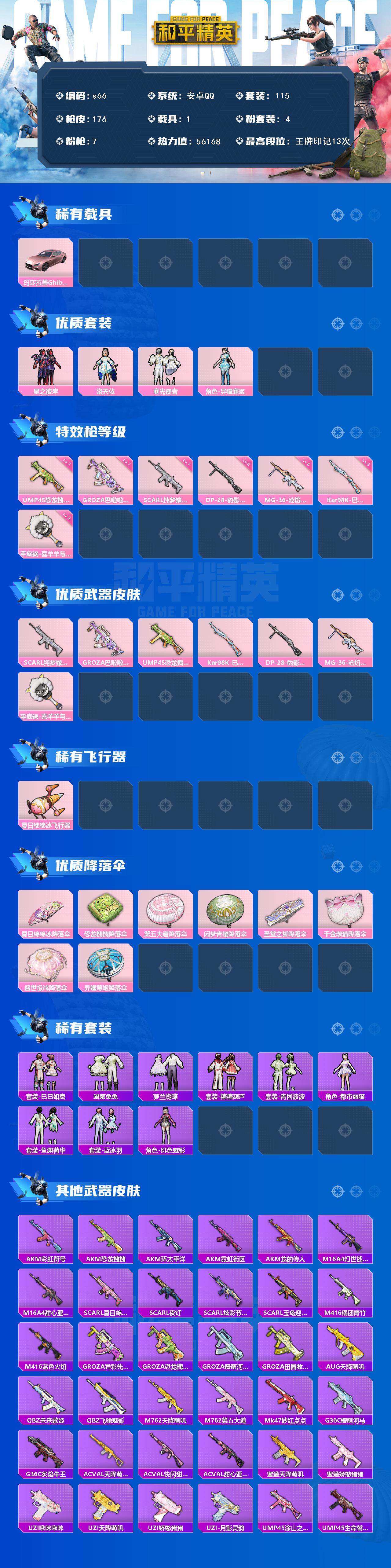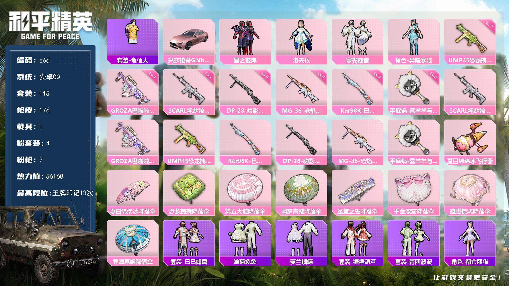 [13869430]安卓 手Q-4粉装-7特效枪-1载具-1粉色飞行器-56168热力值-13王牌印记-115套装-176枪皮