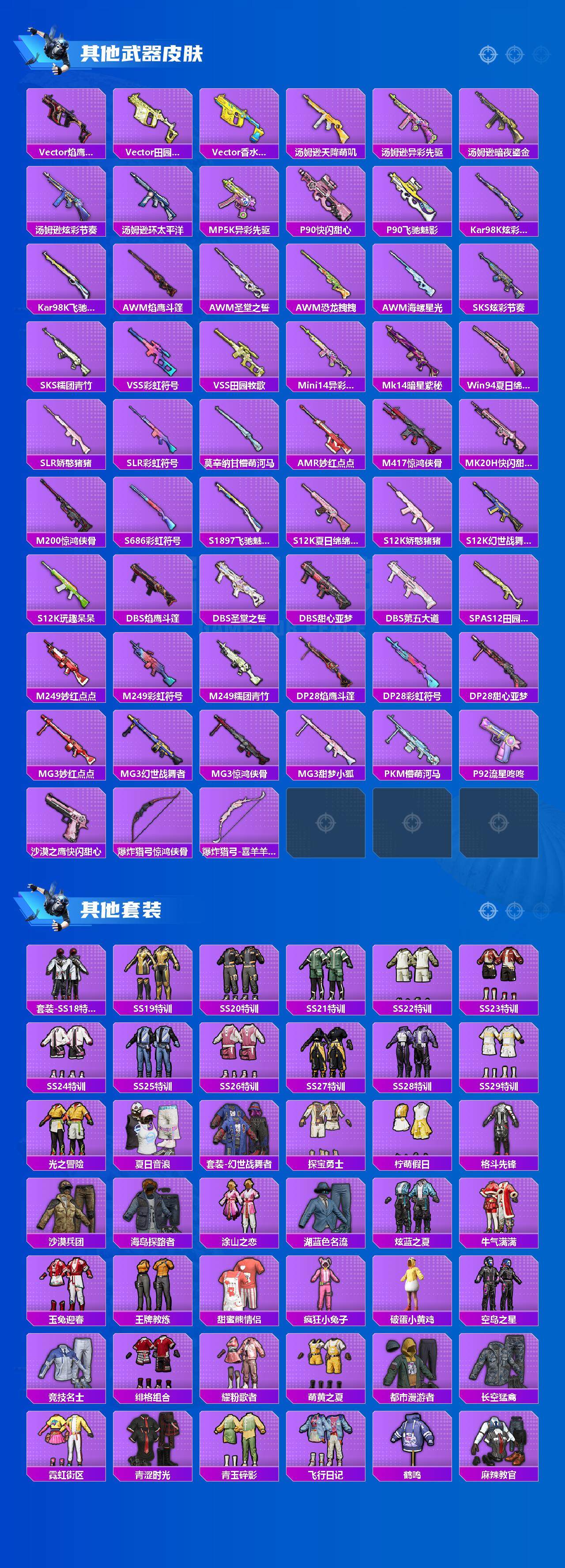 - [12030091]9粉装 8特效枪 2载具 12印记 可二次 可修改实名 身法装备:都市猎人,暗影哥特(红眼罩),Mark.06(新蓝螳螂) 优质装备:合金龙骨(蓝),甜心巧克力,都市猎人,M416心之恋语,梦幻火箭(新101)(新火箭少女101粉色套装),宝贝奶油派,天使彩虹糖,智能音符,星之彼岸,DP-28暗夜鎏金,SCAR-L纯梦嫁纱,Kar98K未来歌姬,七级SCAR-L-纯梦嫁纱,七级DP-28-暗夜鎏金,七级M416-心之恋语,UMP45量子极限,千金淑猫,GROZA-镜光银凌,Kar98K-巳巳如意 热门装扮:蔷薇星,闲梦青缨,动感兔斯基,鹰眼刺客,呆萌铁蟹,都市猎人 载具:冰绡玉鳞 稀有枪皮:DP-28-豹影疾电 五级特效枪:五级UMP45-量子极限,五级GROZA-镜光银凌,五级Kar98K-巳巳如意,五级DP-28-豹影疾电 四级特效枪:四级Kar98K-未来歌姬 紫色装扮:幻彩翩翩,SS23特训,妙红点点,霓虹热舞,SS30特训套装,SS31特训套装,云朵鹅,彩虹兔,雪绒豹,SS33特训套装,青涩时光,旭日情侣,田园牧歌,轻风白浪,和煦暖阳,SS22特训,顶瓜瓜,坚韧舞者,冰爽海盐,浓情蜜辣,风暴特警,飞行日记,魅力单车,鹤鸣,黑色伏地魔,龙的传人,龟仙人,冰河战士,龙魂突击队,蝶变,香桃花海,霓虹街区,超能勇士,都市漫游者,长空猛禽,极光猎影,蓝海鲸歌,街头潮人,涂山之恋,清新柠檬,灰色格斗者,海岛探路者,柠萌假日,血色贵族,糯粉咩咩,缤纷果语,荣耀,蓝彩潮人,蓝色运动,甜蜜告白,空岛之星,白熊同盟,萝兰蝴蝶,SS29特训,达芬奇,星途旅人,雏菊兔兔,热情海星,SS28特训,创世·追猎,Mark.06(新蓝螳螂),鱼渊荷华,燕燕于飞,巳巳如意,森林游猎者,风玲,智谋强哥,小狗蛇点点,异域银装,青团波波,糖糖葫芦,棉花软糖,竞技名士,都市丽猫,街头风暴,暗影哥特(红眼罩),红熊茄茄,纯真浪花,深海梦境,惊鸿侠骨,神气柴柴,懵萌河马,SS24特训(SS24特训套装),SS25特训,绝对偶像,锦衣飞扬,冰公主,SS27特训,焰鹰斗篷,幻羽潜行,无暇誓言,浪漫天命,小丑鱼,星河浪客,SS26特训,春光漫游,快闪甜心,贝斯之夜,小鸟芋圆,大橘大利,SS32特训服(SS32特训套装),春日漫步,糯粉咪咪(套装-糯粉咩咩),蓝冰羽,绯格组合,萌黄之夏,紫幽梦,粉恋花,白糯