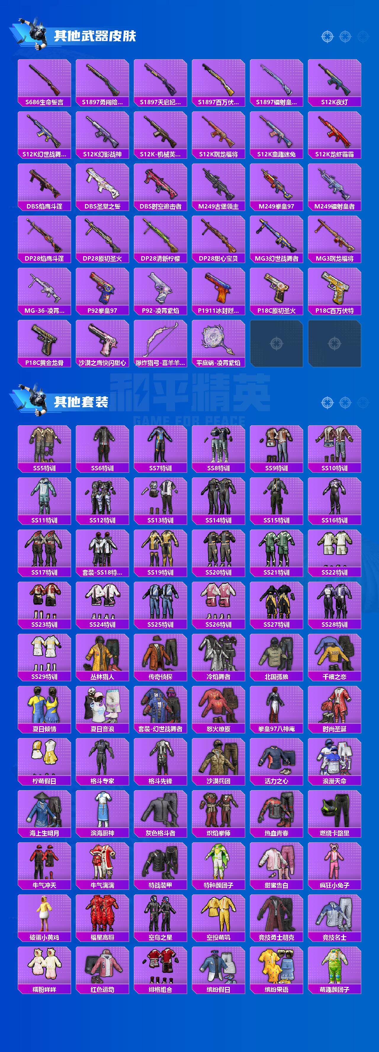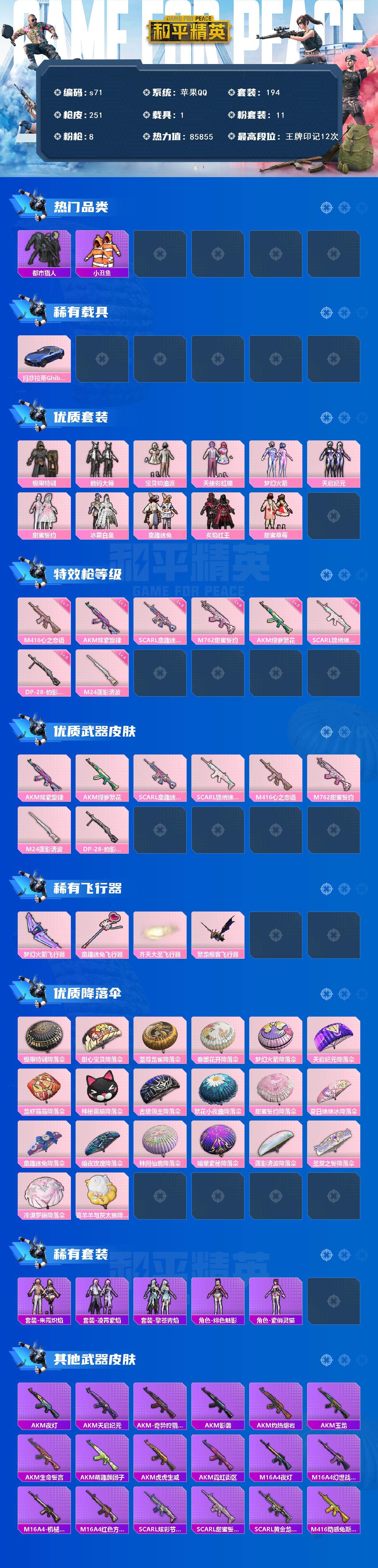 [13869446]苹果 手Q-11粉装-8特效枪-1载具-4粉色飞行器-85855热力值-12王牌印记-194套装-251枪皮 【热门品类】:粉装-梦幻火箭,粉装-童趣迷兔,套装-浪漫天命,套装-都市猎人,套装-小丑鱼,套装-奇异狩猎者,套装-龟仙人,套装-糯粉咩咩 【粉色载具】:玛莎拉蒂Ghibli(蓝) 【粉色套装】:粉装-极限特训,粉装-数码大师,粉装-宝贝奶油派,粉装-天使彩虹糖,粉装-梦幻火箭,粉装-天启纪元,粉装-甜蜜誓约,粉装-冰霜白皇,粉装-童趣迷兔,粉装-炙焰红王,粉装-甜蜜草莓 【粉色枪皮等级】:AKM-炫紫旋律(七级),AKM-绿萝繁花(五级),SCAR-L-童趣迷兔(六级),SCAR-L-锦绣绵绵(五级),M416-心之恋语(七级),M762-甜蜜誓约(六级),M24-莲影清波(四级),DP-28-豹影疾电(五级) 【粉色枪皮】:AKM-炫紫旋律,AKM-绿萝繁花,SCAR-L-童趣迷兔,SCAR-L-锦绣绵绵,M416-心之恋语,M762-甜蜜誓约,M24-莲影清波,DP-28-豹影疾电 【粉色飞行器】:梦幻火箭飞行器,童趣迷兔飞行器,齐天大圣飞行器,繁龙极客飞行器 【粉色降落伞】:极限特训降落伞,甜心宝贝降落伞,至尊龙雀降落伞,春暖花开降落伞,梦幻火箭降落伞,天启纪元降落伞,龙虾霸霸降落伞,神秘黑猫降落伞,古堡领主降落伞,繁花小夜曲降落伞,甜蜜誓约降落伞,夏日绵绵冰降落伞,童趣迷兔降落伞,暗夜玫瑰降落伞,林间仙鹿降落伞,暗星紫秘降落伞,莲影清波降落伞,圣堂之誓降落伞,冷漠罗丽降落伞,喜羊羊与灰太狼降落伞 【稀有套装】:套装-龟仙人,套装-朱霞炽焰,套装-凌霄紫焰,套装-擎苍青焰,角色-绯色魅影,角色-紫俏灵猫 【稀有枪皮】:AKM-夜灯,AKM-天启纪元,AKM-奇异狩猎者,AKM-影袭,AKM-灼热熔岩,AKM-玉龙,AKM-生命誓言,AKM-萌趣颜团子,AKM-虎虎生威,AKM-霓虹街区,M16A4-夜灯,M16A4-幻世战舞者,M16A4-机械英豪,M16A4-红色方程式,SCAR-L-炫彩节奏,SCAR-L-甜蜜誓约,SCAR-L-黄金龙骨,M416-动感兔斯基,M416-夜灯,M416-糯团青竹,M416-红色方程式,M416-罗小黑,M416-蓝色火焰,GROZA-异彩先驱,GROZA-治愈之星,GROZA-甜蜜草莓,GROZA-银河战甲,G