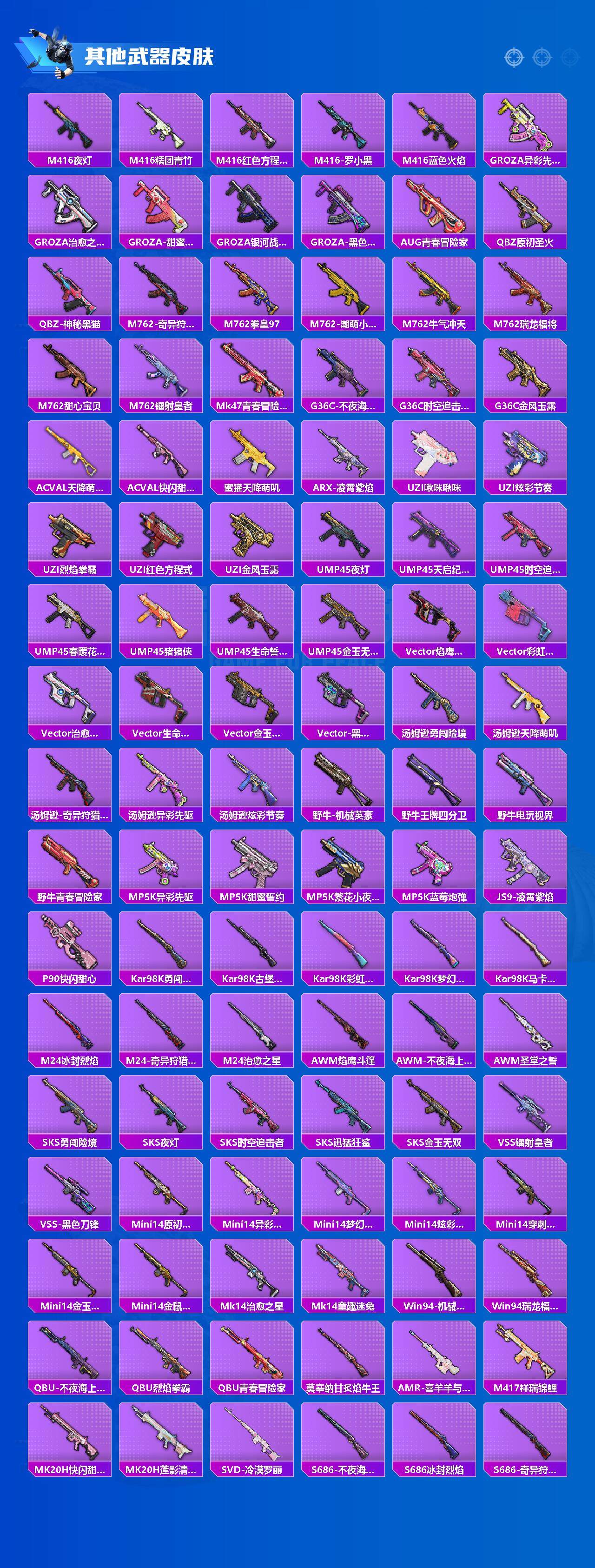 【稀有枪皮】:AKM-夜灯,AKM-天启纪元,AKM-奇异狩猎者,AKM-影袭,AKM-灼热熔岩,AKM-玉龙,AKM-生命誓言,AKM-萌趣颜团子,AKM-虎虎生威,AKM-霓虹街区,M16A4-夜灯,M16A4-幻世战舞者,M16A4-机械英豪,M16A4-红色方程式,SCAR-L-炫彩节奏,SCAR-L-甜蜜誓约,SCAR-L-黄金龙骨,M416-动感兔斯基,M416-夜灯,M416-糯团青竹,M416-红色方程式,M416-罗小黑,M416-蓝色火焰,GROZA-异彩先驱,GROZA-治愈之星,GROZA-甜蜜草莓,GROZA-银河战甲,G