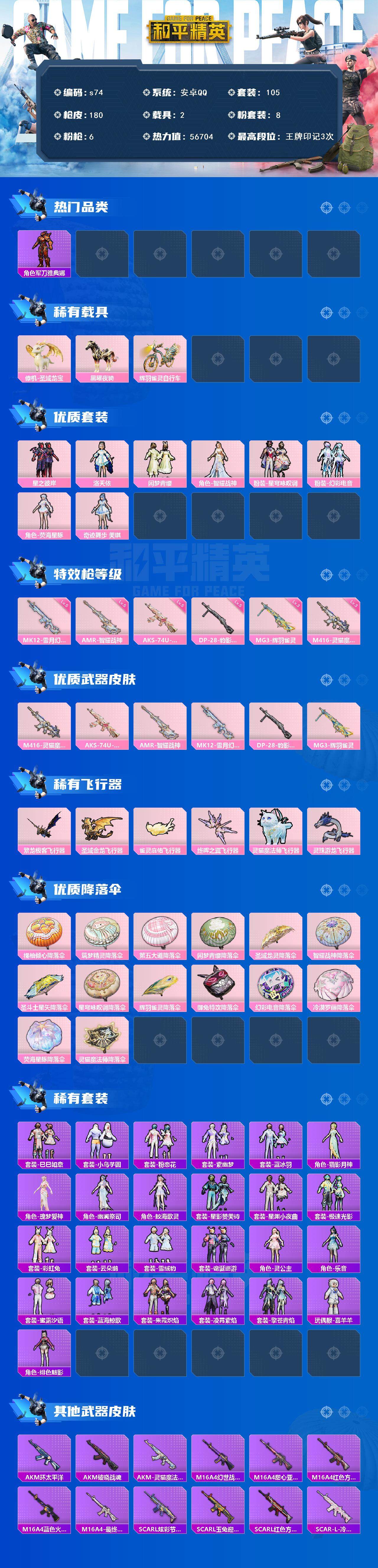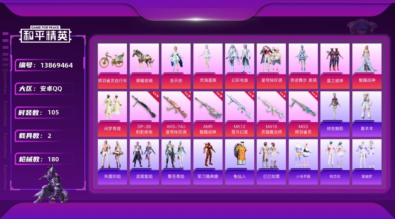 [13869464]安卓 手Q-8粉装-6特效枪-2载具-6粉色飞行器-56704热力值-3王牌印记-105套装-180枪皮 【热门品类】:角色-军刀雅典娜,套装-龟仙人 【粉色载具】:僚机-圣域龙宝,黑曜夜骑,辉羽雀灵自行车 【粉色套装】:粉装-星之彼岸,角色-洛天依,粉装-闲梦青缨,角色-智耀战神,粉装-星穹咏叹调,粉装-幻彩电音,角色-荧海星豚,角色-奇迹舞步 美琪 【粉色枪皮等级】:M416-灵猫魔法师(三级),AKS-74U-星穹咏叹调(五级),AMR-智耀战神(五级),MK12-雪月幻音(五级),DP-28-豹影疾电(五级),MG3-辉羽雀灵(三级) 【粉色枪皮】:M416-灵猫魔法师,AKS-74U-星穹咏叹调,AMR-智耀战神,MK12-雪月幻音,DP-28-豹影疾电,MG3-辉羽雀灵 【粉色飞行器】:繁龙极客飞行器,圣域金龙飞行器,雀灵庇佑飞行器,终晖之翼飞行器,灵猫魔法师飞行器,灵珠游龙飞行器 【粉色降落伞】:橘柚倾心降落伞,筑梦精灵降落伞,第五大道降落伞,闲梦青缨降落伞,圣域龙灵降落伞,智耀战神降落伞,圣斗士星矢降落伞,星穹咏叹调降落伞,辉羽雀灵降落伞,御兔特攻降落伞,幻彩电音降落伞,冷漠罗丽降落伞,荧海星豚降落伞,灵猫魔法师降落伞 【稀有套装】:套装-龟仙人,套装-巳巳如意,套装-小鸟芋圆,套装-粉恋花,套装-紫幽梦,套装-蓝冰羽,角色-猎影月神,角色-瑰梦爱神,角色-幽澜祭司,角色-鲛海歌灵,套装-星影赞美诗,套装-星渊小夜曲,套装-极速光影,套装-彩虹兔,套装-云朵鹅,套装-雪绒豹,套装-诡诞巡游,角色-灵公主,角色-乐音,套装-蜜露汐语,套装-蓝海鲸歌,套装-朱霞炽焰,套装-凌霄紫焰,套装-擎苍青焰,玩偶服-喜羊羊,角色-绯色魅影 【稀有枪皮】:AKM-环太平洋,AKM-破晓战魂,AKM-灵猫魔法师,M16A4-幻世战舞者,M16A4-甜心亚梦,M16A4-红色方程式,M16A4-蓝色火焰,M16A4-最终圣卫者,SCAR-L-炫彩节奏,SCAR-L-玉兔迎春,SCAR-L-红色方程式,SCAR-L-冷漠罗丽,M416-糯团青竹,M416-红色方程式,M416-蓝色火焰,GROZA-彩虹符号,GROZA-恐龙拽拽,GROZA-荧海星豚,AUG-耀粉歌者,QBZ-未来歌姬,QBZ-飞驰魅影,M762-天降萌叽,M762-第五大道,M762-云朵鹅,G36C