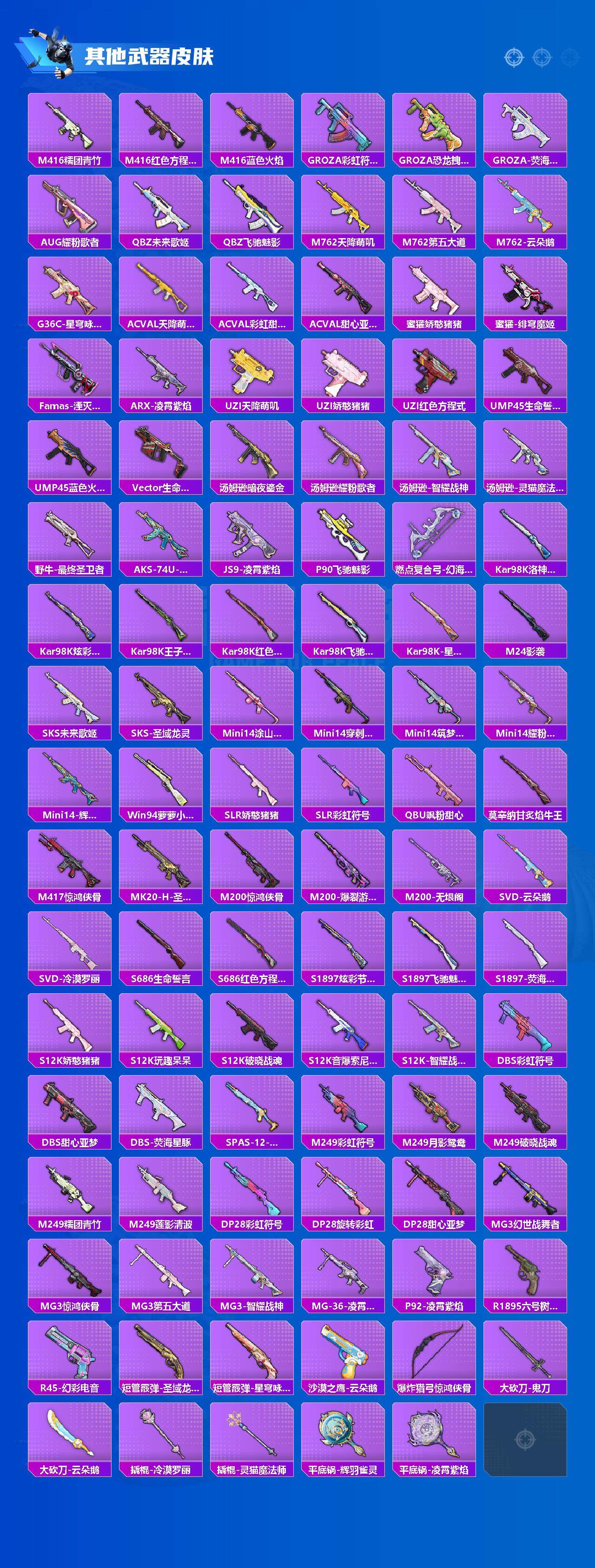 【粉色枪皮】:M416-灵猫魔法师,AKS-74U-星穹咏叹调,AMR-智耀战神,MK12-雪月幻音,DP-28-豹影疾电,MG3-辉羽雀灵