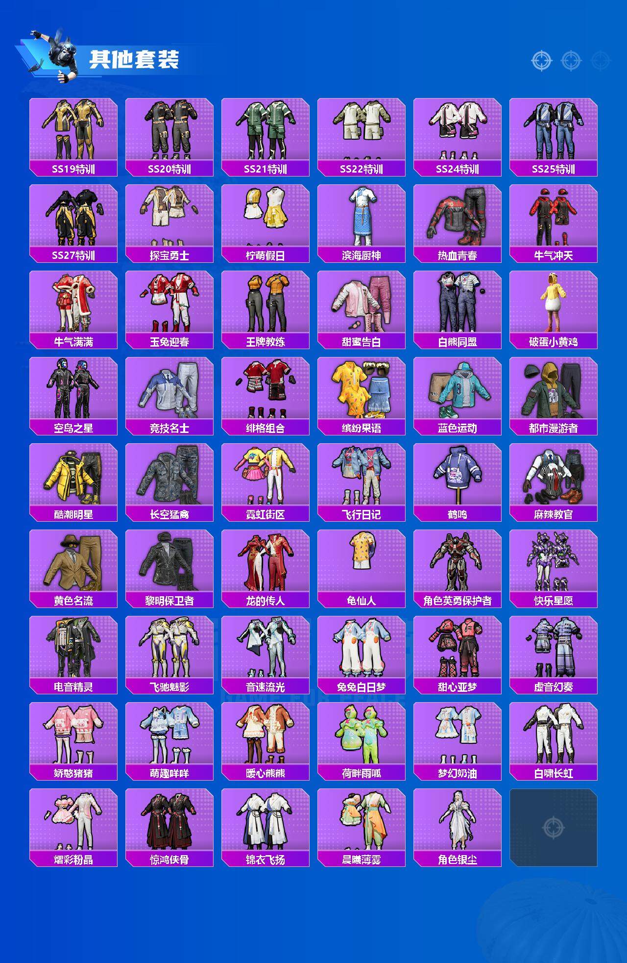 【稀有套装】:套装-龟仙人,套装-巳巳如意,套装-小鸟芋圆,套装-粉恋花,套装-紫幽梦,套装-蓝冰羽,角色-猎影月神,角色-瑰梦爱神,角色-幽澜祭司,角色-鲛海歌灵,套装-星影赞美诗,套装-星渊小夜曲,套装-极速光影,套装-彩虹兔,套装-云朵鹅,套装-雪绒豹,套装-诡诞巡游,角色-灵公主,角色-乐音,套装-蜜露汐语,套装-蓝海鲸歌,套装-朱霞炽焰,套装-凌霄紫焰,套装-擎苍青焰,玩偶服-喜羊羊,角色-绯色魅影