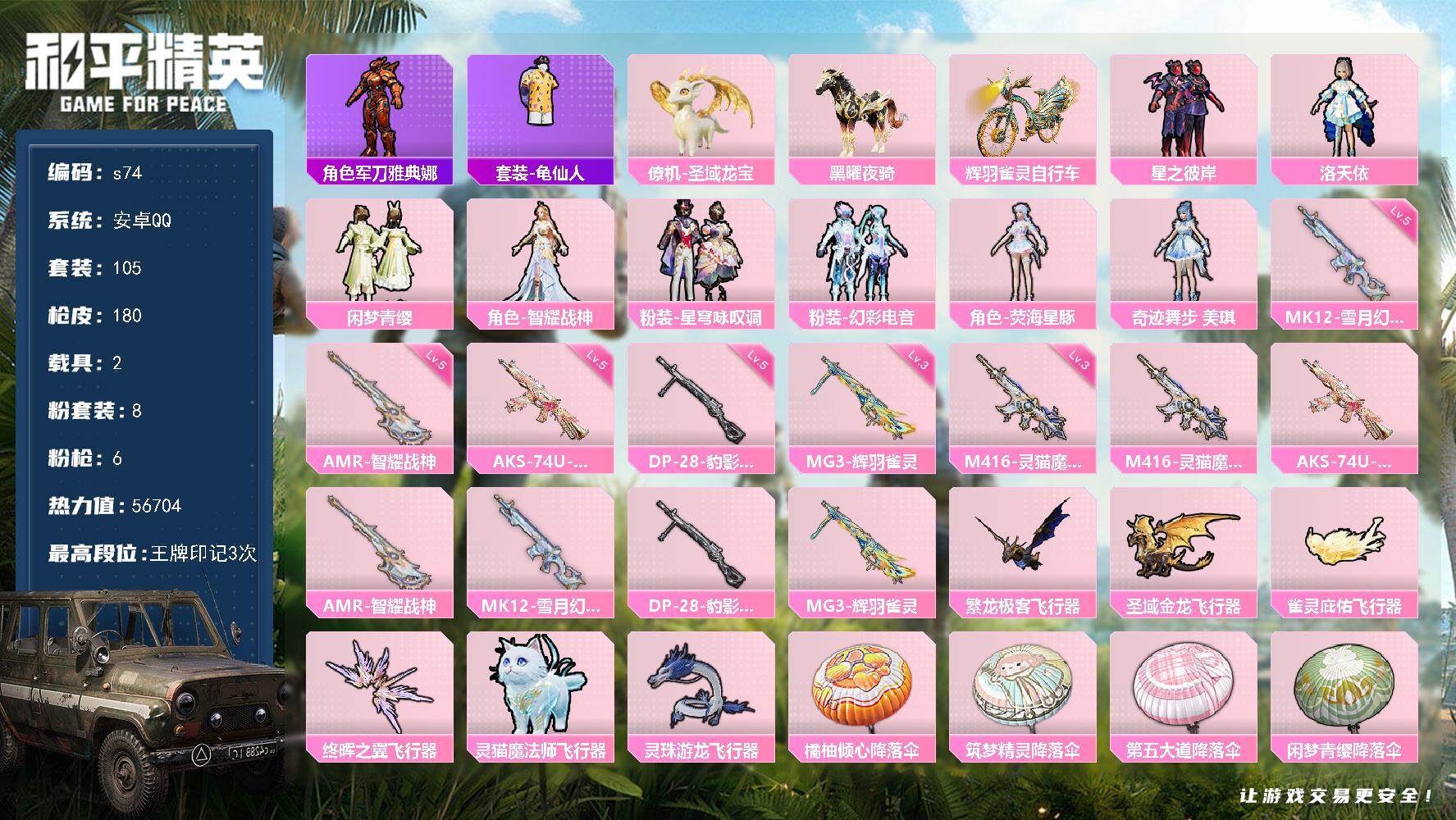 [13869464]安卓 手Q-8粉装-6特效枪-2载具-6粉色飞行器-56704热力值-3王牌印记-105套装-180枪皮