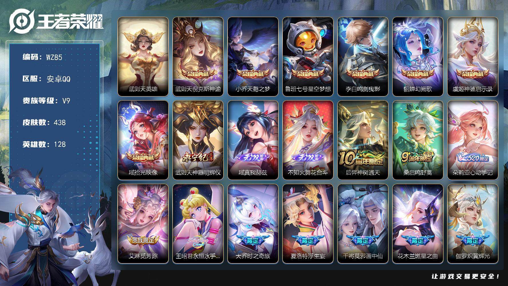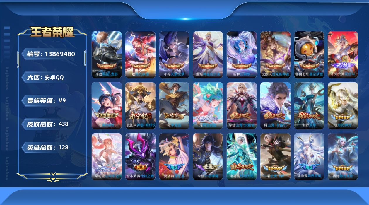 [13869480]安卓Q-V9-至尊星耀IV段位-128英雄-438皮肤-7典藏-0珍品无双-3无双-0珍品传说-43传说-151史诗 【英雄全皮】:李信全皮,盾山全皮,蒙恬全皮,阿古朵全皮,夏洛特全皮,空空儿全皮,影全皮 【荣耀典藏】:武则天英雄,武则天倪克斯神谕,小乔天鹅之梦,鲁班七号星空梦想,李白鸣剑曳影,貂蝉幻阙歌,虞姬神鉴启示录,瑶拾光映像 【无双皮肤】:武则天神器明辉仪,瑶真我赫兹,不知火舞花合斗 【传说皮肤】:后羿神树通天,桑启鸣野蒿,朵莉亚心动手记,艾琳觅芳踪,王昭君永恒水手月亮,大乔时之奇旅,夏洛特浮生妄,干将莫邪画中仙,花木兰燃星之曲,伽罗炽翼辉光,孙悟空齐天大圣,小乔山海琳琅生,曜山海苍雷引,李信山海炽霜斩,李白诗剑行,王昭君星穹之声,百里守约碎云,露娜启示之音,瑶时之祈愿,孙尚香异界灵契,貂蝉遇见胡旋,赵云淬星耀世,王昭君乞巧织情,西施游龙清影,曜李逍遥 ,周瑜音你心动,小乔音你心动,诸葛亮时雨天司,铠绛天战甲,镜炽阳神光,虞姬启明星使,曜云鹰飞将,李信一念神魔,刘备时之恋人,伽罗太华,貂蝉猫影幻舞,张良黄金白羊座,干将莫邪久胜战神,虞姬云霓雀翎,梦奇胖达荣荣,貂蝉仲夏夜之梦,宫本武藏地狱之眼,武则天海洋之心 【限定皮肤】:暃埋骨钱,蔡文姬夏日便利店,大乔绒语心约,虞姬夏日便利店,姜子牙天穹之誓,狄仁杰阴阳师,小乔纯白花嫁,小乔山海琳琅生,赵云皇家上将,赵云百木心枪,墨子神迹守卫,妲己热情桑巴,妲己时之彼端,嬴政优雅恋人,孙尚香蔷薇恋人,孙尚香异界灵契,鲁班七号狮舞东方,鲁班七号乒乒小将,庄周云端筑梦师,庄周玄嵩,庄周高山流水,阿轲迷踪丽影,钟无艳超时空战士,孙膑天狼运算者,扁鹊奇幻香踪,白起夜都怪侠,芈月幻夜卜梦,周瑜真爱至上,周瑜赤莲之焰,元歌云间偶戏,元歌无心,夏侯惇朔风刀,甄姬幽恒,甄姬女儿国国王,甄姬游园惊梦,甄姬落雪兰心,曹操烛龙,马可波罗山海玄木吟,狄仁杰魔术师,狄仁杰万华元夜,达摩星际陆战队,达摩沙漠行僧,项羽海滩派对,老夫子醍醐杖,老夫子航海奇遇记,貂蝉遇见胡旋,程咬金演武夺筹,露娜启示之音,刘邦夺宝奇兵,韩信逐梦之影,韩信飞衡,韩信傲雪梅枪,王昭君凤凰于飞,王昭君午后时光,王昭君星穹之声,兰陵王金庭之子,花木兰燃星之曲,亚瑟潮玩骑士王,孙悟空至尊宝,孙悟空孙行者,孙悟空齐天大圣,牛魔御旌,后羿圣弓游侠,李元芳匿光侦查者,李元芳云中旅人,虞