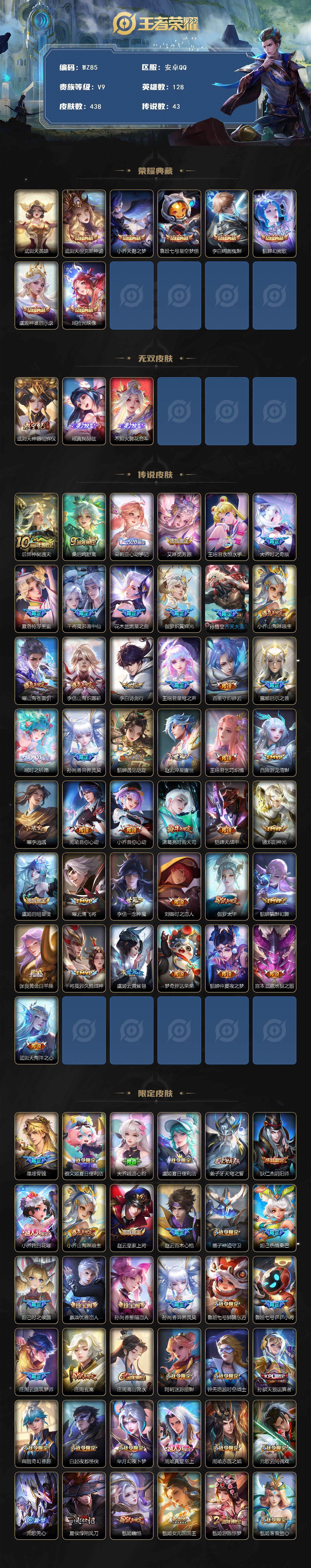 [13869480]安卓Q-V9-至尊星耀IV段位-128英雄-438皮肤-7典藏-0珍品无双-3无双-0珍品传说-43传说-151史诗