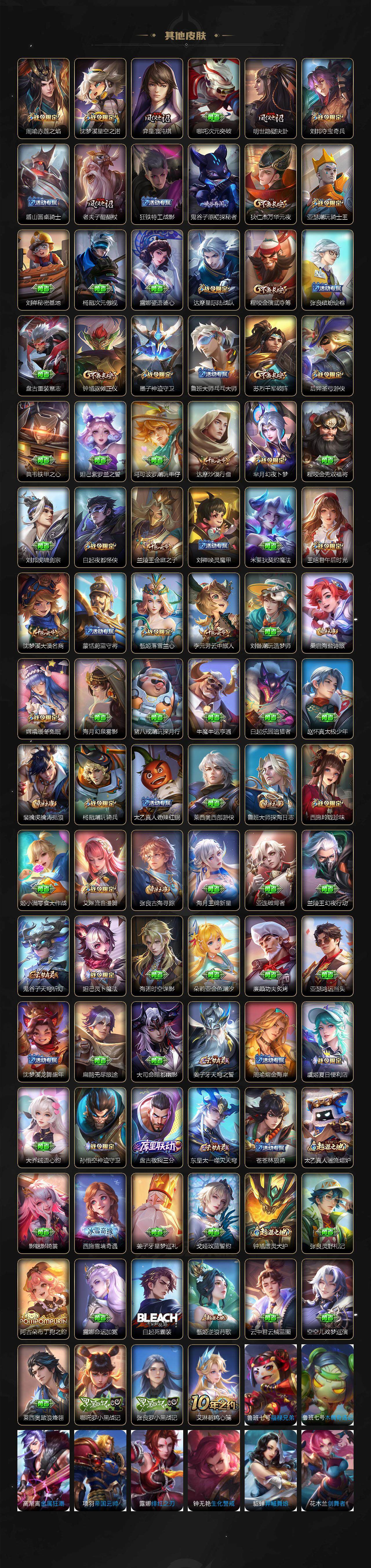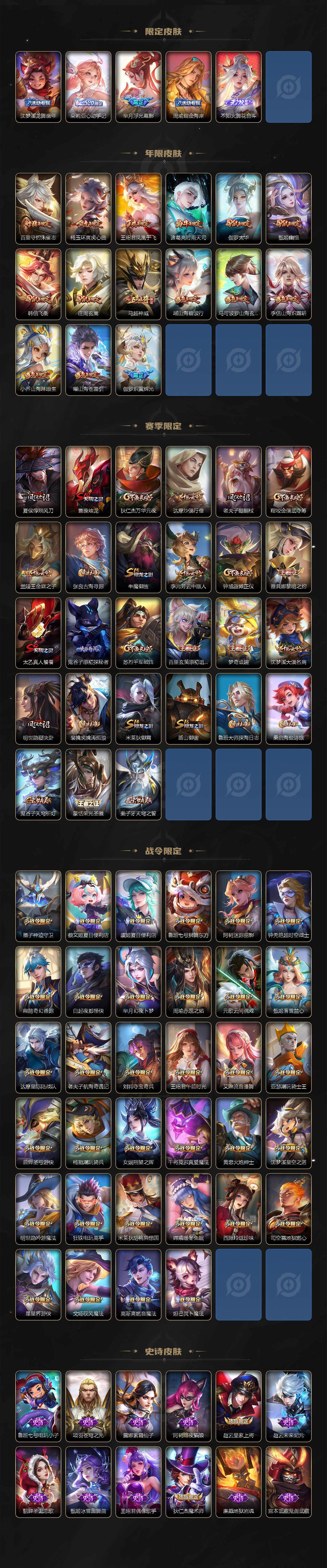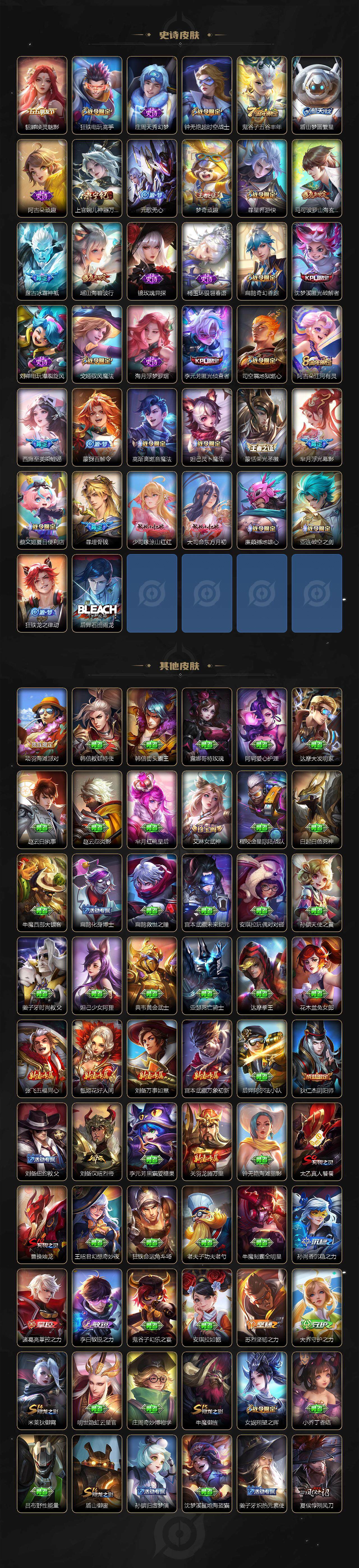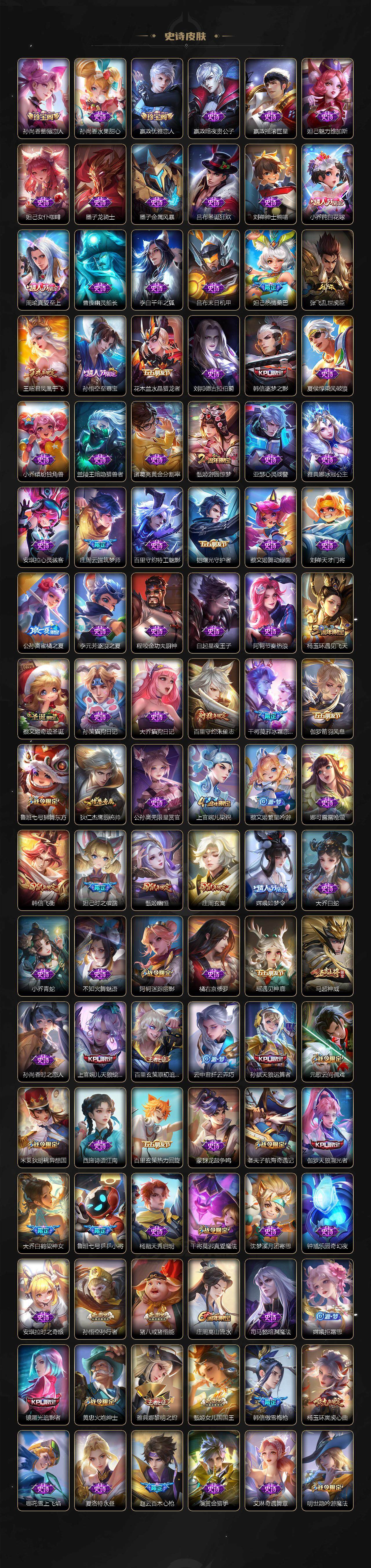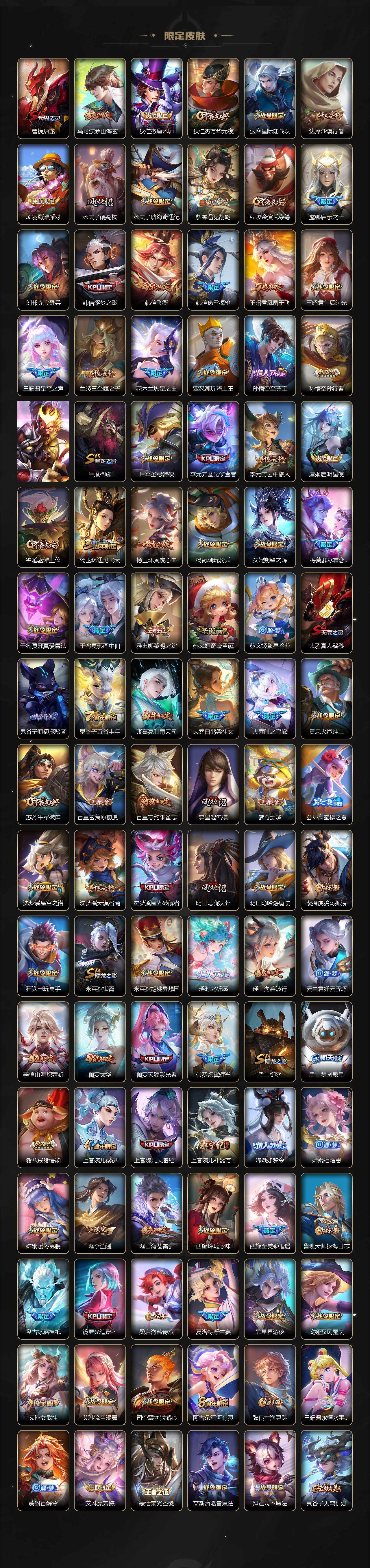 【限定皮肤】:暃埋骨钱,蔡文姬夏日便利店,大乔绒语心约,虞姬夏日便利店,姜子牙天穹之誓,狄仁杰阴阳师,小乔纯白花嫁,小乔山海琳琅生,赵云皇家上将,赵云百木心枪,墨子神迹守卫,妲己热情桑巴,妲己时之彼端,嬴政优雅恋人,孙尚香蔷薇恋人,孙尚香异界灵契,鲁班七号狮舞东方,鲁班七号乒乒小将,庄周云端筑梦师,庄周玄嵩,庄周高山流水,阿轲迷踪丽影,钟无艳超时空战士,孙膑天狼运算者,扁鹊奇幻香踪,白起夜都怪侠,芈月幻夜卜梦,周瑜真爱至上,周瑜赤莲之焰,元歌云间偶戏,元歌无心,夏侯惇朔风刀,甄姬幽恒,甄姬女儿国国王,甄姬游园惊梦,甄姬落雪兰心,曹操烛龙,马可波罗山海玄木吟,狄仁杰魔术师,狄仁杰万华元夜,达摩星际陆战队,达摩沙漠行僧,项羽海滩派对,老夫子醍醐杖,老夫子航海奇遇记,貂蝉遇见胡旋,程咬金演武夺筹,露娜启示之音,刘邦夺宝奇兵,韩信逐梦之影,韩信飞衡,韩信傲雪梅枪,王昭君凤凰于飞,王昭君午后时光,王昭君星穹之声,兰陵王金庭之子,花木兰燃星之曲,亚瑟潮玩骑士王,孙悟空至尊宝,孙悟空孙行者,孙悟空齐天大圣,牛魔御旌,后羿圣弓游侠,李元芳匿光侦查者,李元芳云中旅人,虞