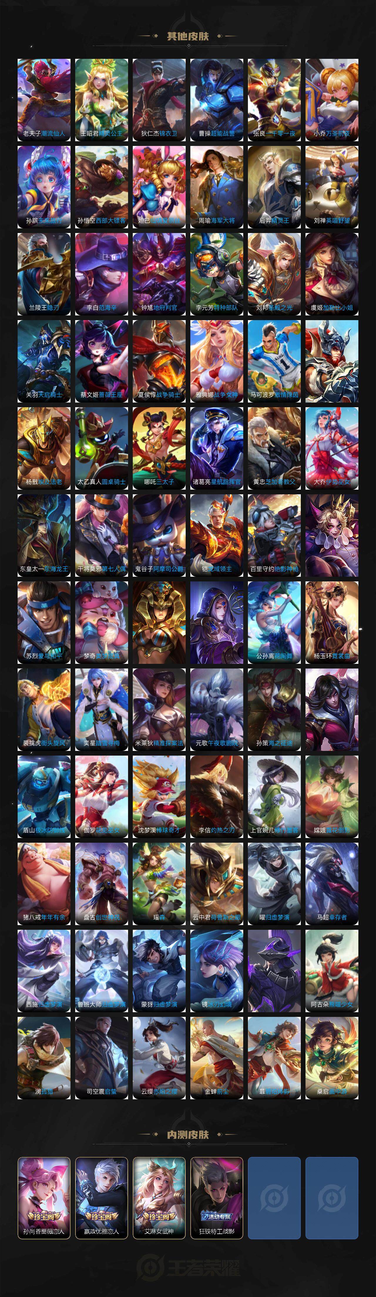 上官婉儿梁祝,诸葛亮时雨天司,马超神威,庄周玄嵩,甄姬幽恒,韩信飞衡,伽罗太华,孙膑天狼运算者,上官婉儿天狼绘梦者,伽罗天狼溯光者,韩信逐梦之影,百里守约朱雀志,王昭君凤凰于飞,小乔纯白花嫁,周瑜真爱至上,嫦娥如梦令,孙悟空至尊宝,妲己热情桑巴,干将莫邪冰霜恋舞曲,蔡文姬奇迹圣诞,妲己时之彼端,公孙离蜜橘之夏,庄周云端筑梦师,鲁班七号乒乒小将,大乔白鹤梁神女,猪八戒猪悟能,孙尚香异界灵契,孙悟空孙行者,甄姬女儿国国王,镜匿光追影者,韩信傲雪梅枪,杨玉环寅虎·心曲,瑶时之祈愿,赵云百木心枪,露娜启示之音,王昭君星穹之声,上官婉儿神器·万象笔,盾山梦圆繁星,李白诗剑行,马可波罗山海·玄木吟,盘古冰霜神祇,瑶山海·碧波行,西施至美·乘鲤谣,桑启鸣野蒿