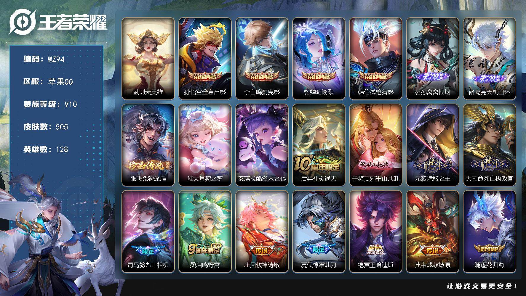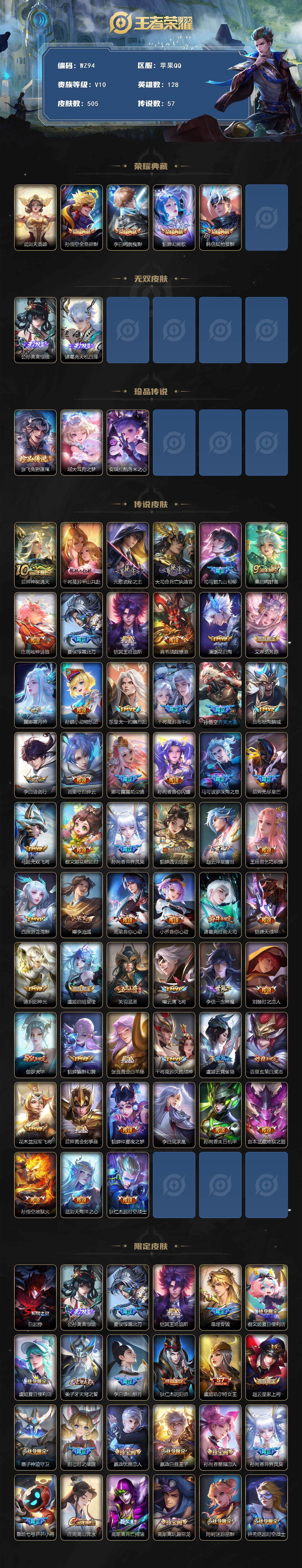 [13869507]苹果Q-V10-最强王者段位-128英雄-505皮肤-4典藏-0珍品无双-2无双-3珍品传说-57传说-164史诗