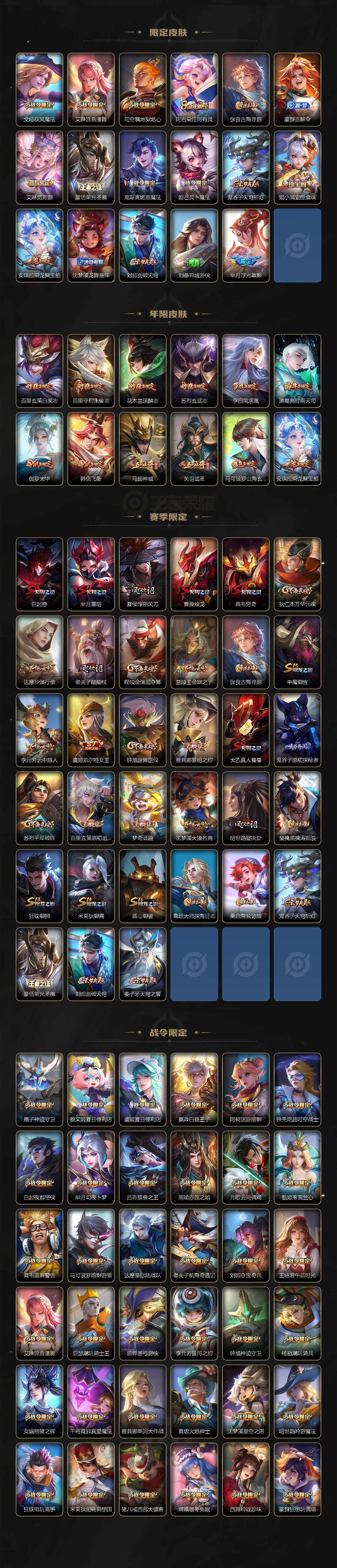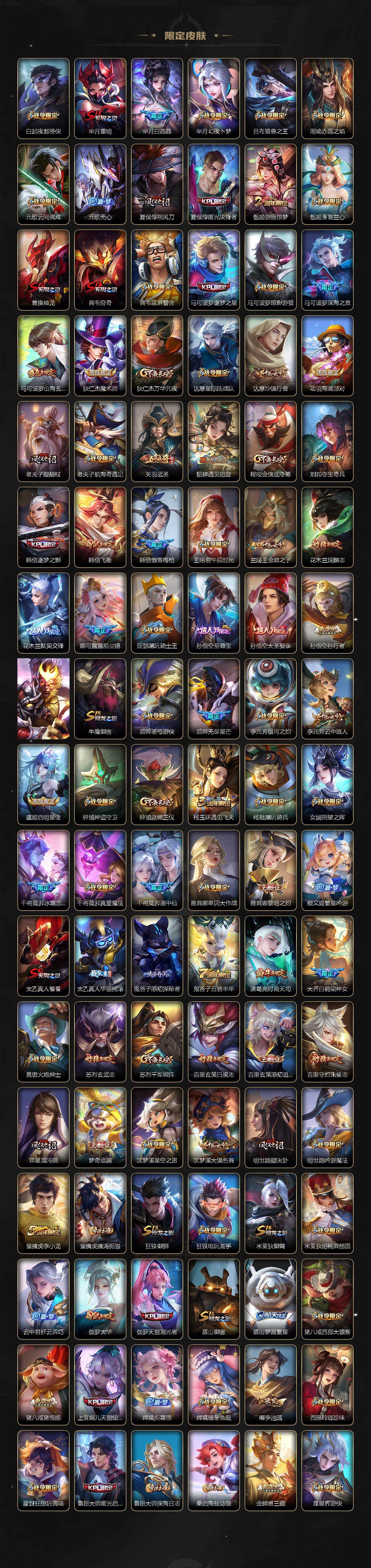 【限定皮肤】:白起狰,公孙离离恨烟,夏侯惇霜北刀,铠冥王哈迪斯,暃埋骨钱,蔡文姬夏日便利店,虞姬夏日便利店,姜子牙天穹之誓,李白谪仙醉月,狄仁杰阴阳师,虞姬凯尔特女王,赵云皇家上将,墨子神迹守卫,妲己时之彼端,嬴政优雅恋人,嬴政白昼王子,孙尚香蔷薇恋人,孙尚香异界灵契,鲁班七号乒乒小将,庄周高山流水,高渐离死亡摇滚,高渐离玩趣恶龙,阿轲迷踪丽影,钟无艳超时空战士,白起夜都怪侠,芈月重明,芈月白晶晶,芈月幻夜卜梦,吕布猎兽之王,周瑜赤莲之焰,元歌云间偶戏,元歌无心,夏侯惇朔风刀,夏侯惇匿光决锋者,甄姬游园惊梦,甄姬落雪兰心,曹操烛龙,典韦穷奇,典韦蓝屏警告,马可波罗逐梦之星,马可波罗暗影