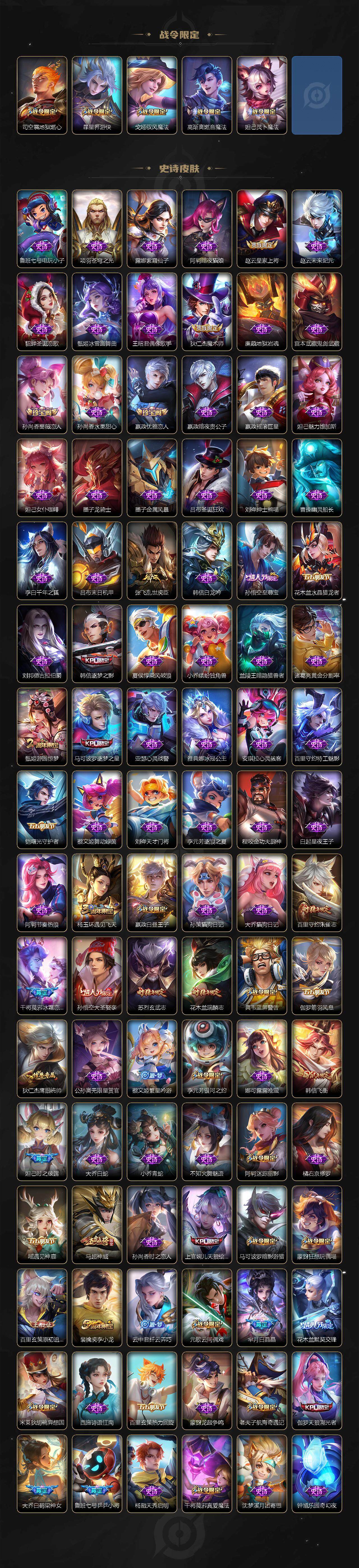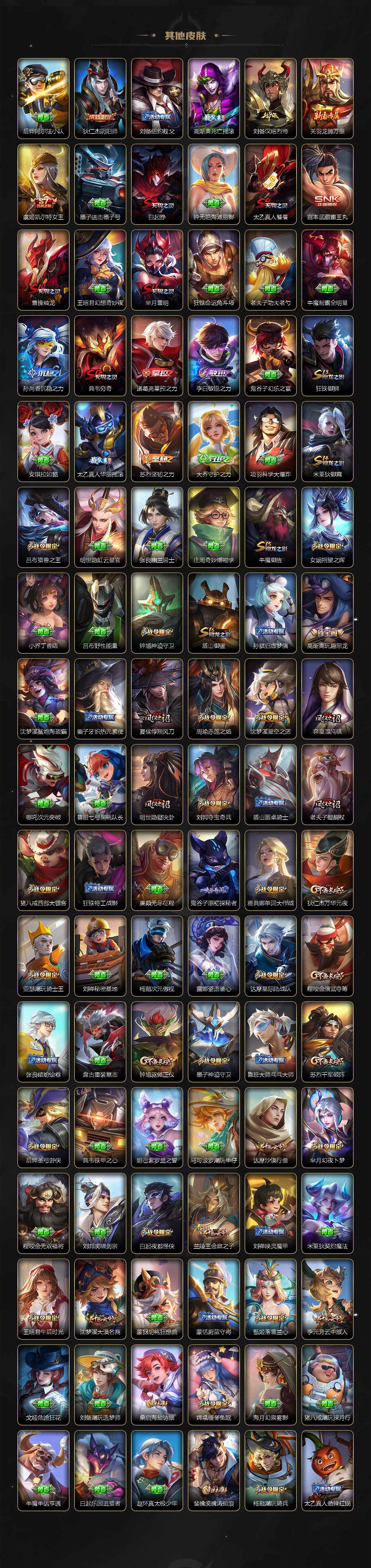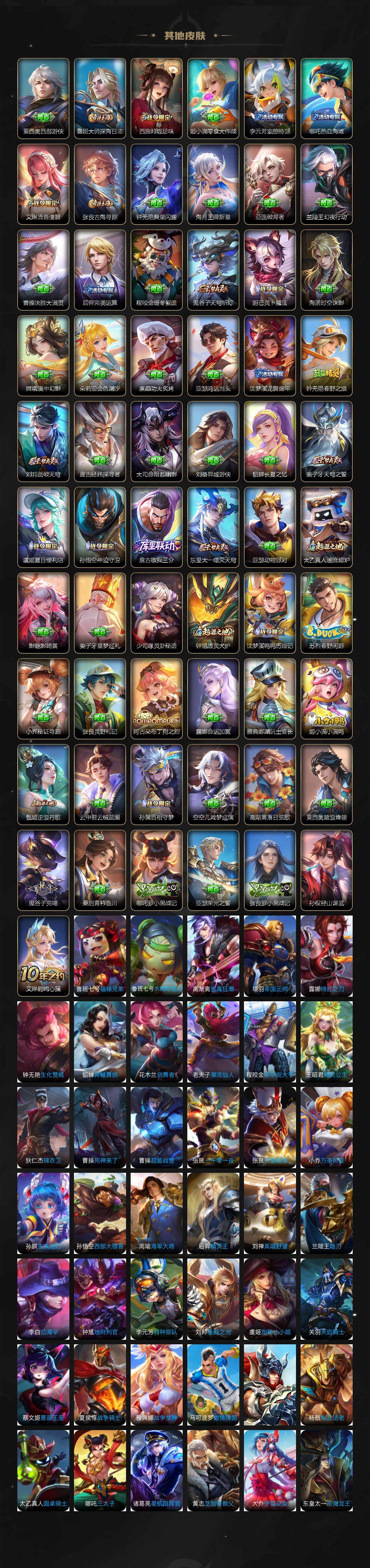 裴擒虎李小龙,诸葛亮时雨天司,关羽武圣,马超神威,韩信飞衡,伽罗太华,上官婉儿天狼绘梦者,伽罗天狼溯光者,马可波罗逐梦之星,韩信逐梦之影,百里玄策白虎志,花木兰瑞麟志,苏烈玄武志,百里守约朱雀志,孙悟空大圣娶亲,花木兰默契交锋,孙悟空至尊宝,干将莫邪冰霜恋舞曲,妲己时之彼端,芈月白晶晶,鲁班七号乒乒小将,大乔白鹤梁神女,猪八戒猪悟能,孙尚香异界灵契,孙悟空孙行者,韩信傲雪梅枪,夏侯惇匿光决锋者,后羿无尽星芒,马可波罗深海之息,金蝉唐三藏,娜可露露前尘镜,鲁班大师匿光启智者,盾山梦圆繁星,李白诗剑行,马可波罗山海·玄木吟,夏侯惇霜北刀,桑启鸣野蒿,艾琳陌上桑