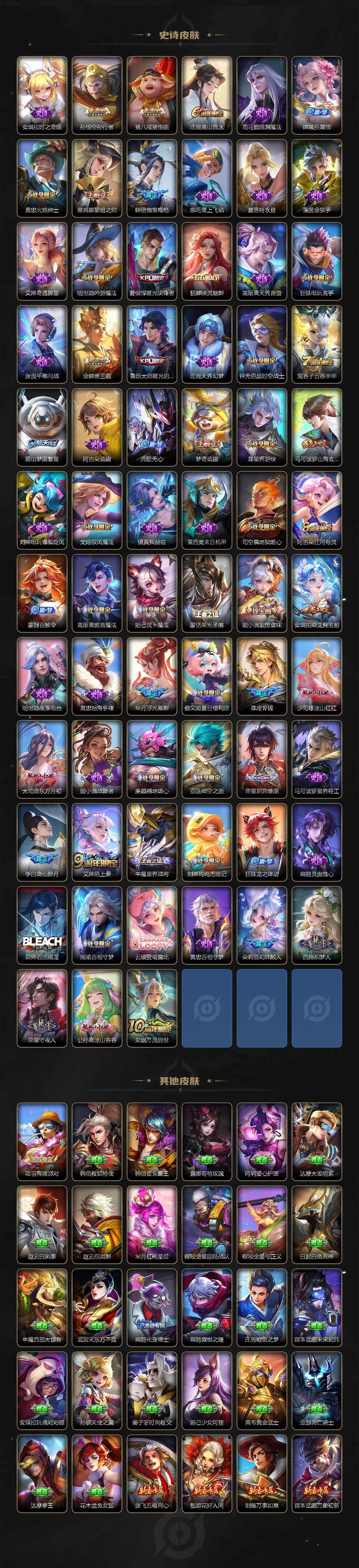【英雄全皮】:刘禅全皮,高渐离全皮,元歌全皮,司马懿全皮,刘邦全皮,孙权全皮,张良全皮,娜可露露全皮,钟馗全皮,太乙真人全皮,鬼谷子全皮,苏烈全皮,狂铁全皮,盾山全皮,猪八戒全皮,大司命全皮,鲁班大师全皮,蒙恬全皮,阿古朵全皮,金蝉全皮,空空儿全皮,影全皮