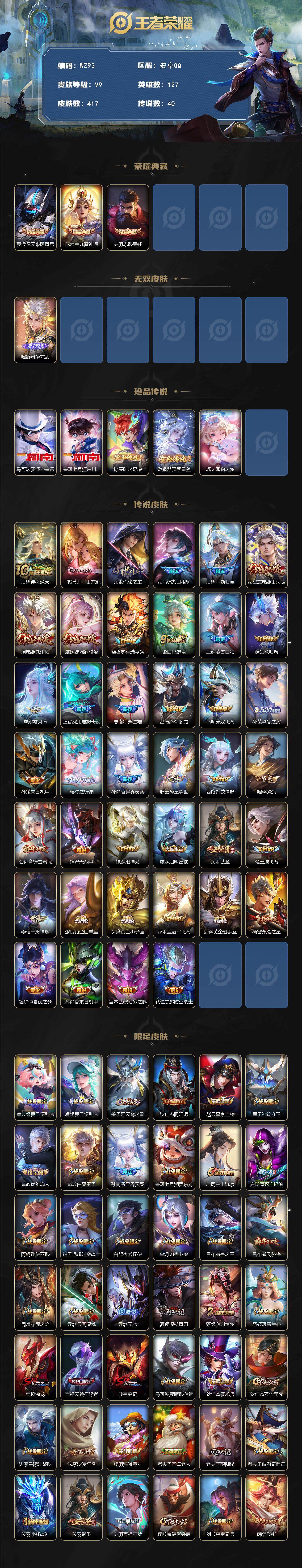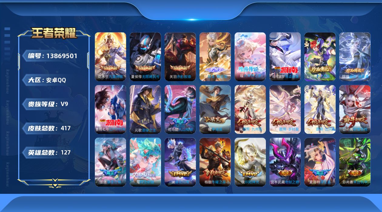 [13869501]安卓Q-V9-最强王者段位-127英雄-417皮肤-3典藏-0珍品无双-1无双-5珍品传说-40传说-122史诗