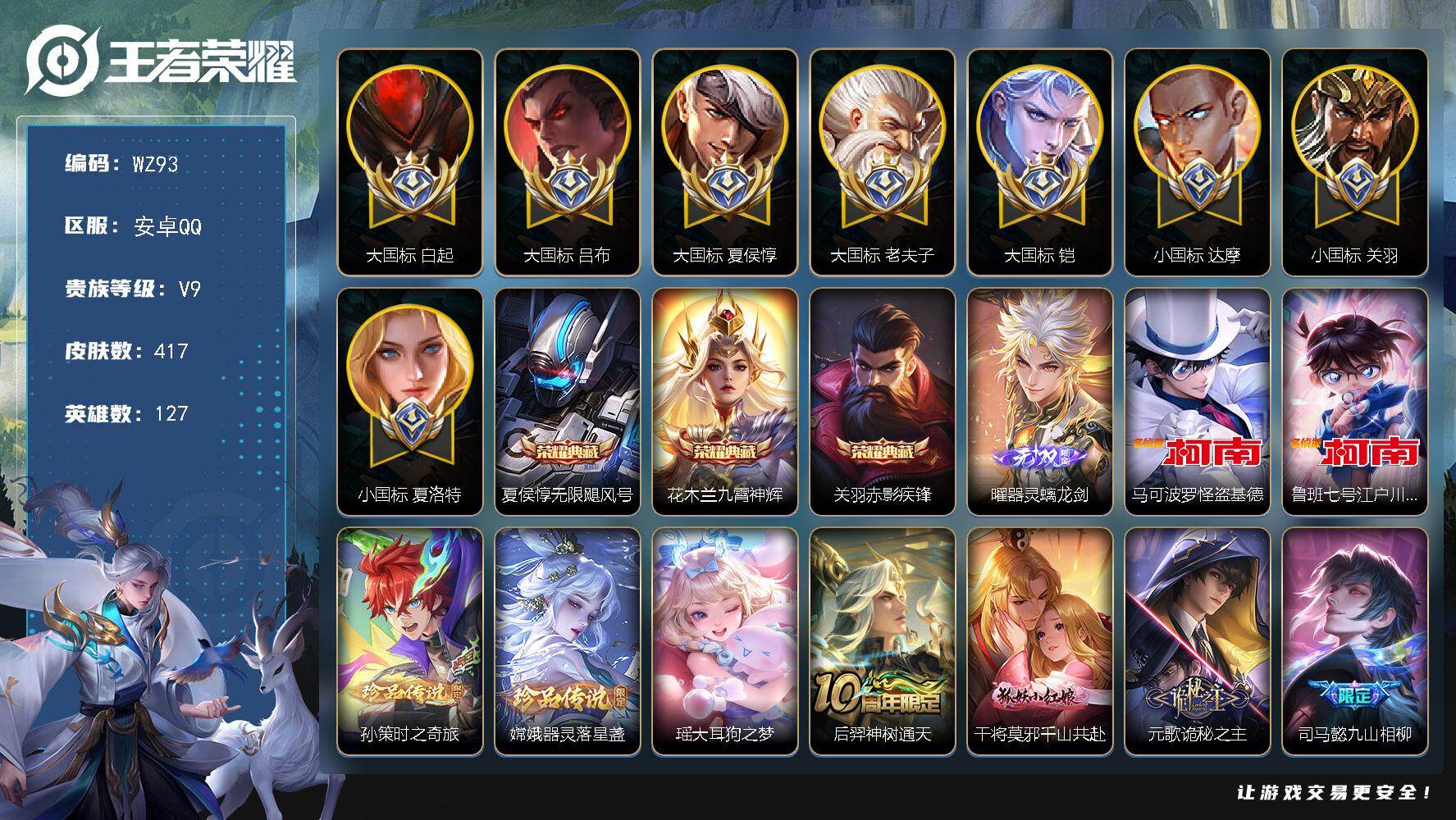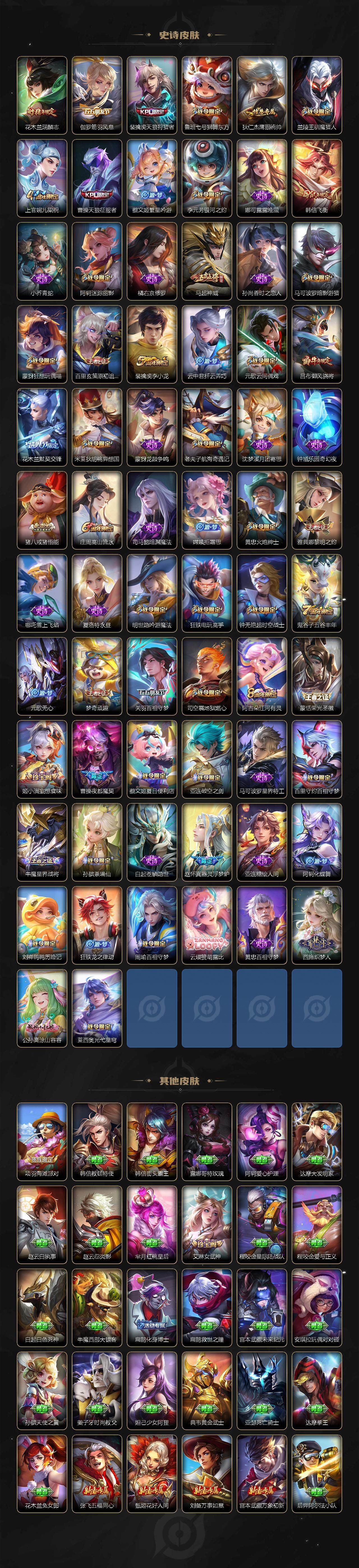 [13869501]安卓Q-V9-最强王者段位-127英雄-417皮肤-3典藏-0珍品无双-1无双-5珍品传说-40传说-122史诗 【英雄全皮】:元歌全皮,达摩全皮,司马懿全皮,刘邦全皮,钟馗全皮,太乙真人全皮,鬼谷子全皮,苏烈全皮,狂铁全皮,猪八戒全皮,亚连全皮,蒙恬全皮,夏洛特全皮,司空震全皮,空空儿全皮,影全皮 【荣耀典藏】:夏侯惇无限飓风号,花木兰九霄神辉,关羽赤影疾锋 【无双皮肤】:曜器灵螭龙剑 【珍品传说】:马可波罗怪盗基德,鲁班七号江户川柯南,孙策时之奇旅,嫦娥器灵落星盏,瑶大耳狗之梦 【传说皮肤】:后羿神树通天,干将莫邪千山共赴,元歌诡秘之主,司马懿九山相柳,后羿千劫归真,司空震愿照山河定,澜愿照九州拓,虞姬愿照岁时盈,裴擒虎祥瑞亨通,桑启鸣野蒿,亚连落雪白狼,澜逐花归海,露娜霜月吟,上官婉儿妄想奇谈,夏洛特浮生妄,吕布怒海麟威,马超无双飞将,孙策挚爱之约,孙策末日机甲,瑶时之祈愿,孙尚香异界灵契,赵云淬星耀世,西施游龙清影,曜李逍遥 ,公孙离祈雪灵祝,铠绛天战甲,镜炽阳神光,虞姬启明星使,关羽武圣,曜云鹰飞将,李信一念神魔,张良黄金白羊座,达摩黄金狮子座,花木兰冠军飞将,后羿黄金射手座,杨戬永曜之星,貂蝉仲夏夜之梦,孙尚香末日机甲,宫本武藏地狱之眼,狄仁杰超时空战士 【限定皮肤】:蔡文姬夏日便利店,虞姬夏日便利店,姜子牙天穹之誓,狄仁杰阴阳师,赵云皇家上将,墨子神迹守卫,嬴政优雅恋人,嬴政白昼王子,孙尚香异界灵契,鲁班七号狮舞东方,庄周高山流水,高渐离死亡摇滚,阿轲迷踪丽影,钟无艳超时空战士,白起夜都怪侠,芈月幻夜卜梦,吕布猎兽之王,吕布御风骁将,周瑜赤莲之焰,元歌云间偶戏,元歌无心,夏侯惇朔风刀,甄姬游园惊梦,甄姬落雪兰心,曹操烛龙,曹操天狼征服者,典韦穷奇,马可波罗暗影游猎,狄仁杰魔术师,狄仁杰万华元夜,达摩星际陆战队,达摩沙漠行僧,项羽海滩派对,老夫子圣诞老人,老夫子醍醐杖,老夫子航海奇遇记,关羽冰锋战神,关羽武圣,关羽百相守梦,程咬金演武夺筹,刘邦夺宝奇兵,韩信飞衡,王昭君午后时光,兰陵王驯魔猎人,兰陵王金庭之子,花木兰青春决赛季,花木兰瑞麟志,花木兰默契交锋,亚瑟潮玩骑士王,孙悟空至尊宝,牛魔御旌,后羿辉光之辰,李元芳银河之约,李元芳云中旅人,虞姬启明星使,钟馗神迹守卫,钟馗驱傩正仪,杨玉环遇见飞天,杨戬永曜之星,雅典娜单词大作战,雅典娜黎明之约,蔡文姬