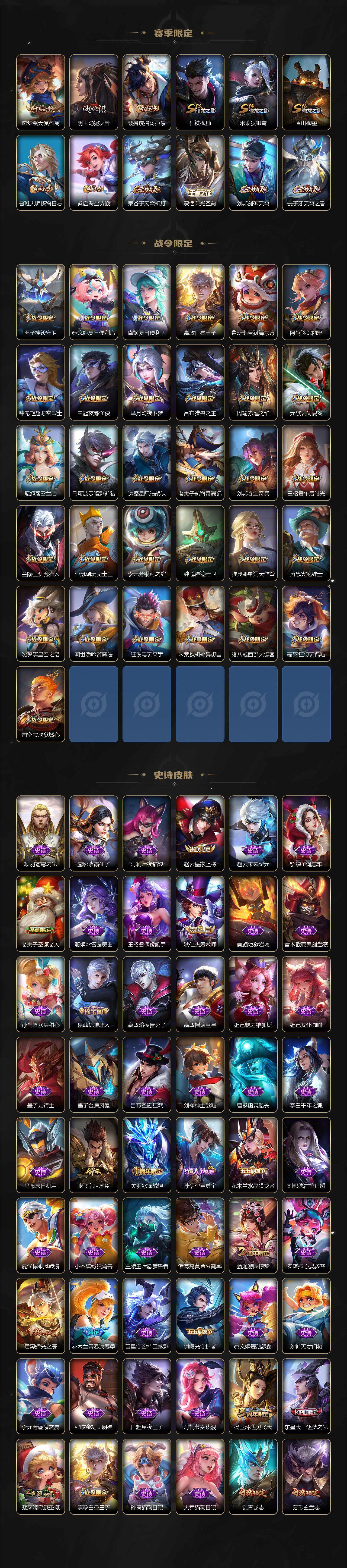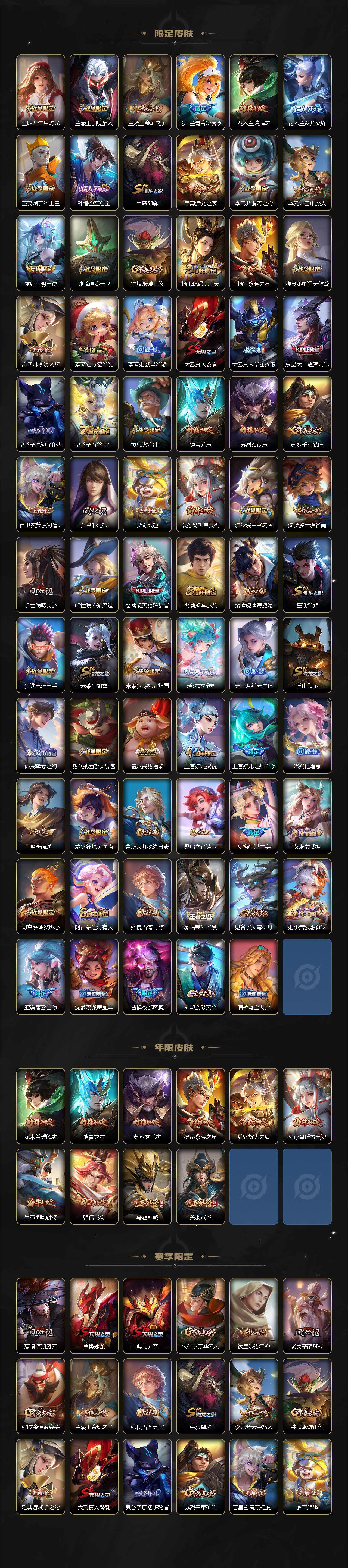 【限定皮肤】:蔡文姬夏日便利店,虞姬夏日便利店,姜子牙天穹之誓,狄仁杰阴阳师,赵云皇家上将,墨子神迹守卫,嬴政优雅恋人,嬴政白昼王子,孙尚香异界灵契,鲁班七号狮舞东方,庄周高山流水,高渐离死亡摇滚,阿轲迷踪丽影,钟无艳超时空战士,白起夜都怪侠,芈月幻夜卜梦,吕布猎兽之王,吕布御风骁将,周瑜赤莲之焰,元歌云间偶戏,元歌无心,夏侯惇朔风刀,甄姬游园惊梦,甄姬落雪兰心,曹操烛龙,曹操天狼征服者,典韦穷奇,马可波罗暗影游猎,狄仁杰魔术师,狄仁杰万华元夜,达摩星际陆战队,达摩沙漠行僧,项羽海滩派对,老夫子圣诞老人,老夫子醍醐杖,老夫子航海奇遇记,关羽冰锋战神,关羽武圣,关羽百相守梦,程咬金演武夺筹,刘邦夺宝奇兵,韩信飞衡,王昭君午后时光,兰陵王驯魔猎人,兰陵王金庭之子,花木兰青春决赛季,花木兰瑞麟志,花木兰默契交锋,亚瑟潮玩骑士王,孙悟空至尊宝,牛魔御旌,后羿辉光之辰,李元芳银河之约,李元芳云中旅人,虞姬启明星使,钟馗神迹守卫,钟馗驱傩正仪,杨玉环遇见飞天,杨戬永曜之星,雅典娜单词大作战,雅典娜黎明之约,蔡文姬