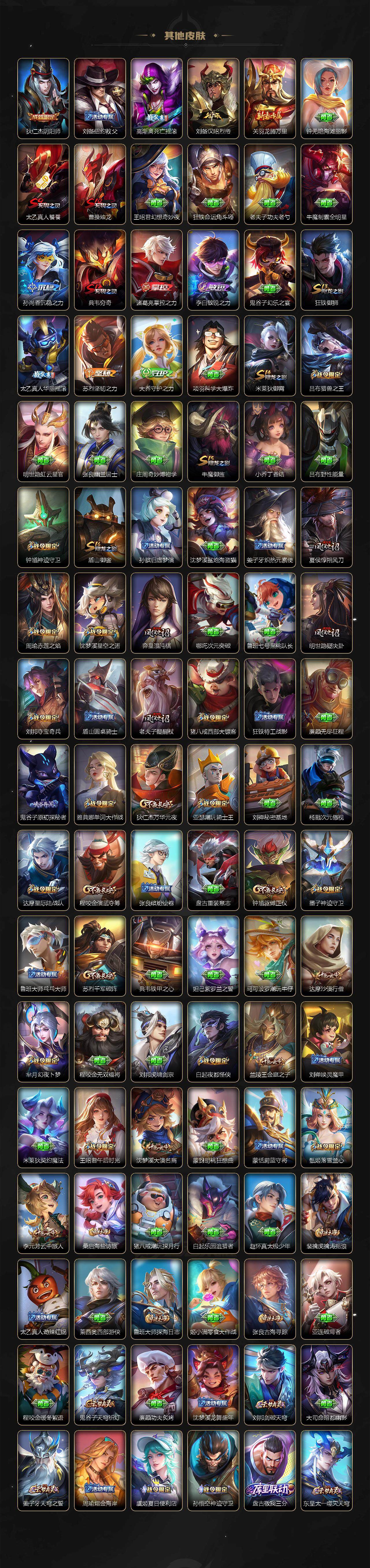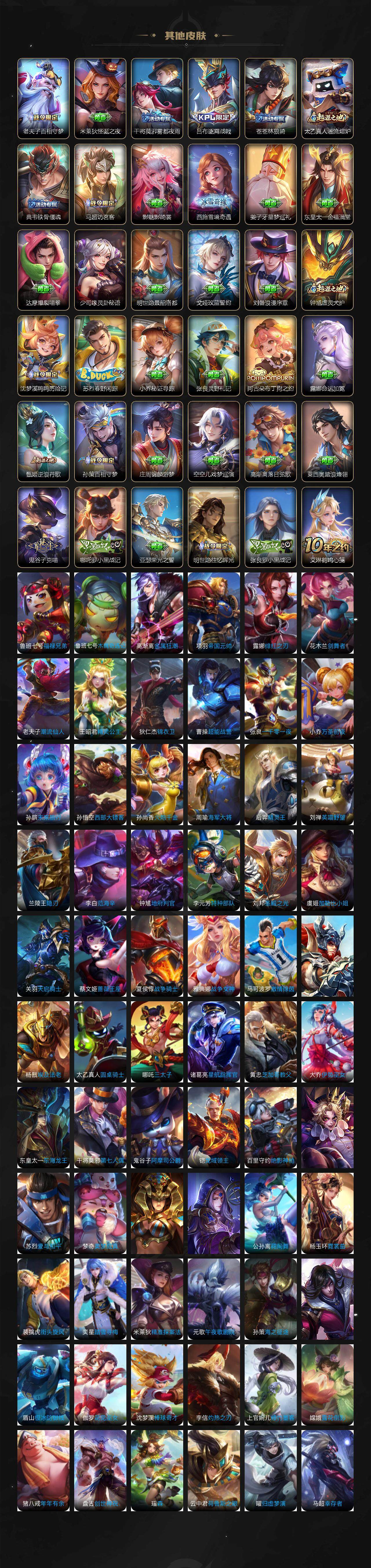 小乔青蛇,娜可露露晚萤,伽罗箭羽风息,李元芳逐浪之夏,大乔猫狗日记,孙策猫狗日记,阿轲节奏热浪,露娜紫霞仙子,诸葛亮黄金分割率,王昭君偶像歌手,项羽苍穹之光,孙尚香时之恋人,阿轲暗夜猫娘,吕布末日机甲,蒙犽龙鼓争鸣,橘右京修罗,墨子龙骑士,嬴政摇滚巨星,刘禅绅士熊喵,刘禅天才门将,白起星夜王子,安琪拉心灵骇客,程咬金功夫厨神,刘邦德古拉伯爵,兰陵王暗隐猎兽者,曹操幽灵船长,宫本武藏鬼剑武藏,司马懿暗渊魔法,钟馗乐园奇幻夜,蔡文姬舞动绿茵,廉颇地狱岩魂,小乔缤纷独角兽,夏侯惇乘风破浪,花木兰水晶猎龙者,铠曙光守护者,墨子金属风暴,百里玄策原初追逐者,吕布圣诞狂欢,貂蝉圣诞恋歌,百里守约特工魅影,嬴政暗夜贵公子,嫦娥拒霜思,雅典娜黎明之约,李白千年之狐,哪吒雪上飞焰,夏洛特永昼,关羽百相守梦,曹操夜都魔契,白起苍鳞隐世,赵怀真器灵·浮梦炉,亚连糖绘人间