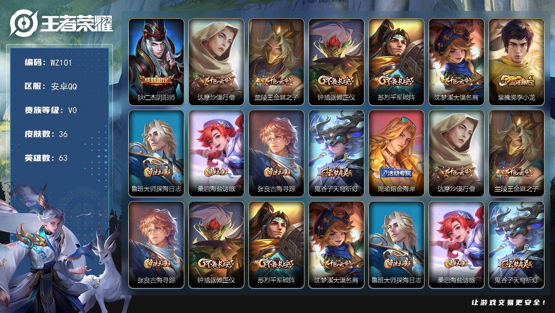 [13869531]安卓Q63英雄-36皮肤7史诗 【限定皮肤】:狄仁杰阴阳师,达摩沙漠行僧,兰陵王金庭之子,钟馗驱傩正仪,苏烈千军破阵,沈梦溪大漠名商,裴擒虎李小龙,鲁班大师探海日志,桑启海盐诗旅,张良古海寻踪,鬼谷子天穹祈灯,周瑜熔金海岸 【赛季限定】:达摩沙漠行僧,兰陵王金庭之子,张良古海寻踪,钟馗驱傩正仪,苏烈千军破阵,沈梦溪大漠名商,鲁班大师探海日志,桑启海盐诗旅,鬼谷子天穹祈灯 【史诗皮肤】:露娜紫霞仙子,甄姬冰雪圆舞曲,嬴政摇滚巨星,妲己魅力维加斯,花木兰水晶猎龙者,刘禅天才门将,裴擒虎李小龙 【其他皮肤】:达摩大发明家,亚瑟死亡骑士,宫本武藏万象初新,狄仁杰阴阳师,宫本武藏霸王丸,钟馗驱傩正仪,苏烈千军破阵,达摩沙漠行僧,兰陵王金庭之子,沈梦溪大漠名商,桑启海盐诗旅,鲁班大师探海日志,张良古海寻踪,后羿完美运算,鬼谷子天穹祈灯,周瑜熔金海岸,艾琳鹤鸣心笺,曹操超能战警,孙悟空西部大镖客,李白范海辛,李元芳特种部队,元歌午夜歌剧院,李信灼热之刃,瑶森,西施归虚梦演,镜冰刃幻境,蒙恬秩序猎龙将,司空震启蛰,暃碧珀绯影 【营地ID】:1887228736