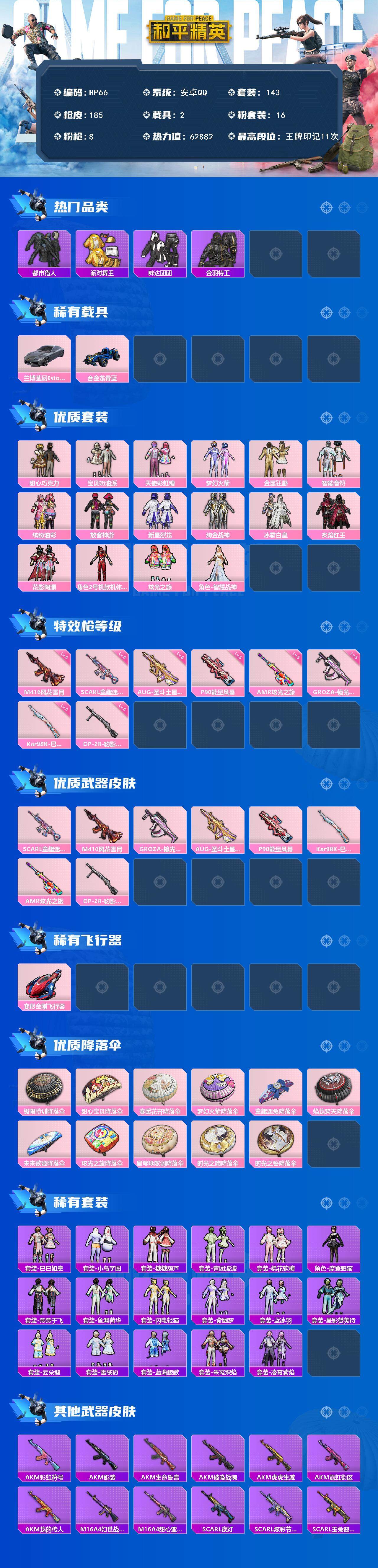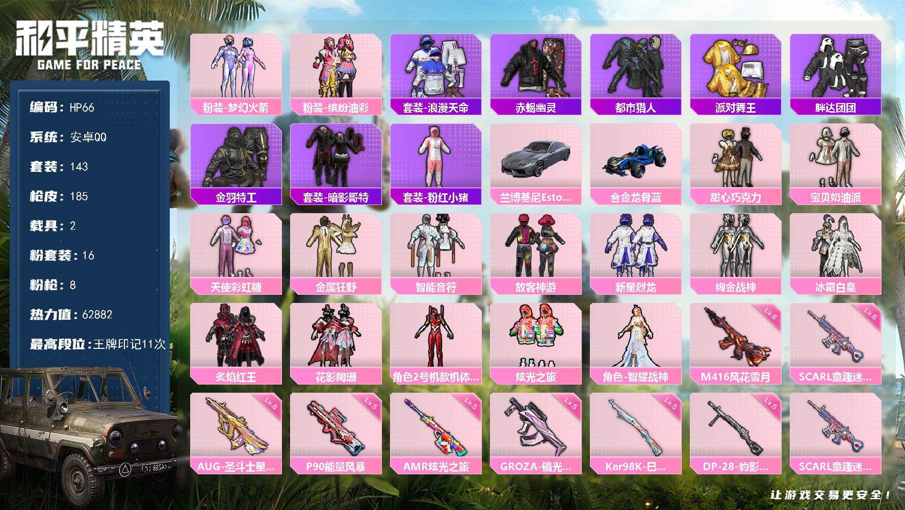[13869550]安卓 手Q-16粉装-8特效枪-2载具-1粉色飞行器-62882热力值-11王牌印记-143套装-185枪皮 【热门品类】:粉装-梦幻火箭,粉装-缤纷油彩,套装-浪漫天命,套装-赤蝎幽灵,套装-都市猎人,套装-派对舞王,套装-胖达团团,套装-金羽特工,套装-暗影哥特,套装-粉红小猪 【粉色载具】:兰博基尼Estoque(银翼灰),合金龙骨(蓝) 【粉色套装】:粉装-甜心巧克力,粉装-宝贝奶油派,粉装-天使彩虹糖,粉装-梦幻火箭,粉装-金属狂野,粉装-智能音符,粉装-缤纷油彩,粉装-放客神游,粉装-新星烈龙,粉装-绚金战神,粉装-冰霜白皇,粉装-炙焰红王,粉装-花影阑珊,角色-2号机款机体服,粉装-炫光之旅,角色-智耀战神 【粉色枪皮等级】:SCAR-L-童趣迷兔(六级),M416-风花雪月(六级),GROZA-镜光银凌(五级),AUG-圣斗士星矢(六级),P90-能量风暴(五级),Kar98K-巳巳如意(五级),AMR-炫光之旅(五级),DP-28-豹影疾电(五级) 【粉色枪皮】:SCAR-L-童趣迷兔,M416-风花雪月,GROZA-镜光银凌,AUG-圣斗士星矢,P90-能量风暴,Kar98K-巳巳如意,AMR-炫光之旅,DP-28-豹影疾电 【粉色飞行器】:变形金刚飞行器 【粉色降落伞】:极限特训降落伞,甜心宝贝降落伞,春暖花开降落伞,梦幻火箭降落伞,童趣迷兔降落伞,焰龙焚天降落伞,未来歌姬降落伞,炫光之旅降落伞,星穹咏叹调降落伞,时光之吻降落伞,时光之誓降落伞 【稀有套装】:套装-巳巳如意,套装-小鸟芋圆,套装-糖糖葫芦,套装-青团波波,套装-棉花软糖,角色-摩登魅猫,套装-燕燕于飞,套装-鱼渊荷华,套装-闪电轻猫,套装-紫幽梦,套装-蓝冰羽,套装-星影赞美诗,套装-云朵鹅,套装-雪绒豹,套装-蓝海鲸歌,套装-朱霞炽焰,套装-凌霄紫焰 【稀有枪皮】:AKM-彩虹符号,AKM-影袭,AKM-生命誓言,AKM-破晓战魂,AKM-虎虎生威,AKM-霓虹街区,AKM-龙的传人,M16A4-幻世战舞者,M16A4-甜心亚梦,SCAR-L-夜灯,SCAR-L-炫彩节奏,SCAR-L-玉兔迎春,M416-夜灯,M416-糯团青竹,GROZA-异彩先驱,GROZA-影袭,GROZA-春暖花开,GROZA-田园牧歌,AUG-天降萌叽,AUG-甜蜜菠萝,AUG-耀粉歌者,AUG