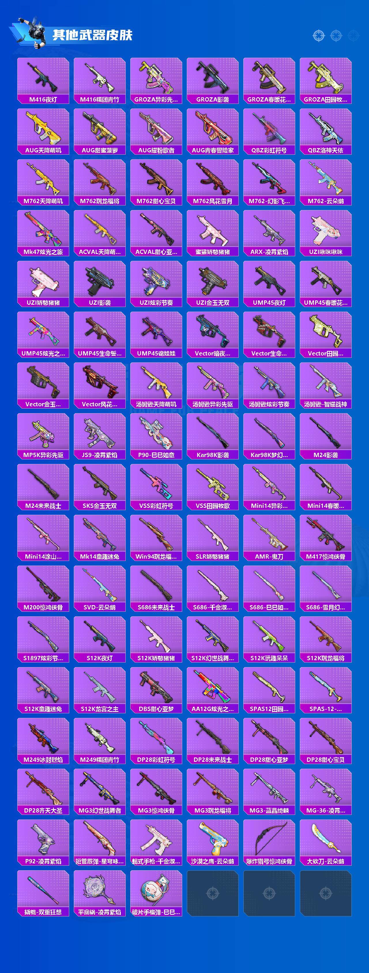 【稀有枪皮】:AKM-彩虹符号,AKM-影袭,AKM-生命誓言,AKM-破晓战魂,AKM-虎虎生威,AKM-霓虹街区,AKM-龙的传人,M16A4-幻世战舞者,M16A4-甜心亚梦,SCAR-L-夜灯,SCAR-L-炫彩节奏,SCAR-L-玉兔迎春,M416-夜灯,M416-糯团青竹,GROZA-异彩先驱,GROZA-影袭,GROZA-春暖花开,GROZA-田园牧歌,AUG-天降萌叽,AUG-甜蜜菠萝,AUG-耀粉歌者,AUG