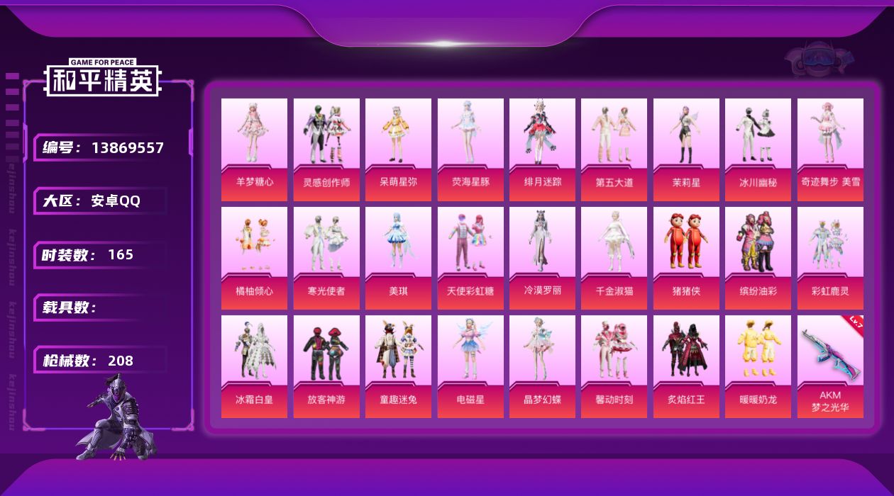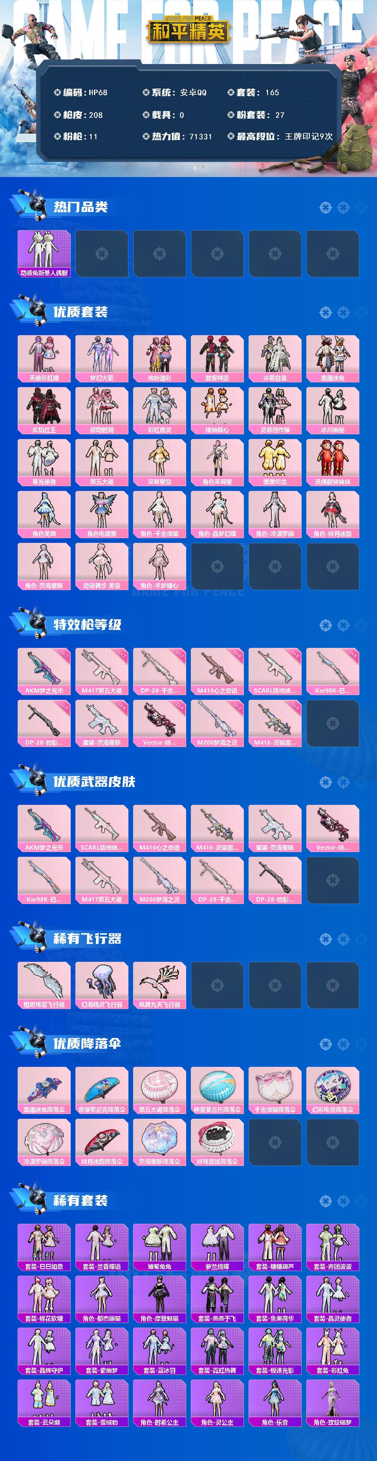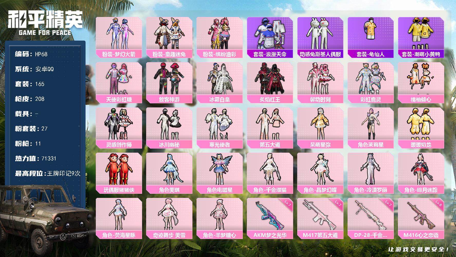 [13869557]安卓 手Q-27粉装-11特效枪-0载具-3粉色飞行器-71331热力值-9王牌印记-165套装-208枪皮 【热门品类】:粉装-梦幻火箭,粉装-童趣迷兔,粉装-缤纷油彩,套装-浪漫天命,套装-动感兔斯基人偶服,套装-龟仙人,套装-潮萌小黄鸭 【粉色套装】:粉装-天使彩虹糖,粉装-梦幻火箭,粉装-缤纷油彩,粉装-放客神游,粉装-冰霜白皇,粉装-童趣迷兔,粉装-炙焰红王,粉装-馨动时刻,粉装-彩虹鹿灵,粉装-橘柚倾心,粉装-灵感创作师,粉装-冰川幽秘,粉装-寒光使者,粉装-第五大道,角色-呆萌星弥,角色-茉莉星,粉装-暖暖奶龙,玩偶服-猪猪侠,角色-美琪,角色-电磁星,角色-千金淑猫,角色-晶梦幻蝶,角色-冷漠罗丽,角色-绯月迷踪,角色-荧海星豚,角色-奇迹舞步 美雪,角色-羊梦糖心 【粉色枪皮等级】:AKM-梦之光华(七级),SCAR-L-锦绣绵绵(五级),M416-心之恋语(六级),M416-灵猫魔法师(三级),蜜獾-荧海星豚(四级),Vector-绯穹魔姬(四级),Kar98K-巳巳如意(五级),M417-第五大道(七级),M200-梦海之灵(三级),DP-28-千金淑猫(七级),DP-28-豹影疾电(五级) 【粉色枪皮】:AKM-梦之光华,SCAR-L-锦绣绵绵,M416-心之恋语,M416-灵猫魔法师,蜜獾-荧海星豚,Vector-绯穹魔姬,Kar98K-巳巳如意,M417-第五大道,M200-梦海之灵,DP-28-千金淑猫,DP-28-豹影疾电 【粉色飞行器】:相思残雪飞行器,幻海精灵飞行器,凤舞九天飞行器 【粉色降落伞】:童趣迷兔降落伞,音爆索尼克降落伞,第五大道降落伞,仲夏莫吉托降落伞,千金淑猫降落伞,幻彩电音降落伞,冷漠罗丽降落伞,绯月迷踪降落伞,荧海星豚降落伞,绯穹魔姬降落伞 【稀有套装】:套装-龟仙人,套装-巳巳如意,套装-兰香蝶语,套装-雏菊兔兔,套装-萝兰蝴蝶,套装-糖糖葫芦,套装-青团波波,套装-棉花软糖,角色-都市丽猫,角色-摩登魅猫,套装-燕燕于飞,套装-鱼渊荷华,套装-晶灵使者,套装-晶辉守护,套装-紫幽梦,套装-蓝冰羽,套装-霓虹热舞,套装-极速光影,套装-彩虹兔,套装-云朵鹅,套装-雪绒豹,角色-时希公主,角色-灵公主,角色-乐音,角色-玫纹锢梦,套装-蜜露汐语,套装-蓝海鲸歌,角色-绛羽幽主,角色-夜瞳黯灵,套装-朱霞炽焰,套