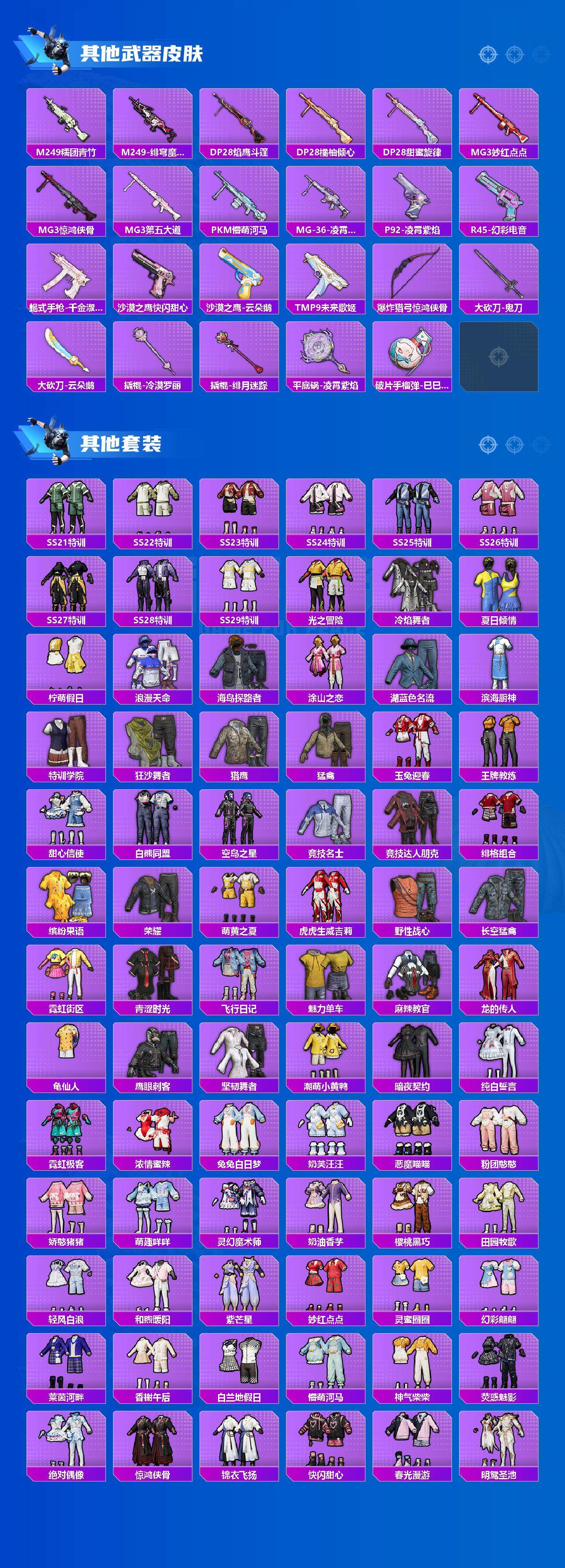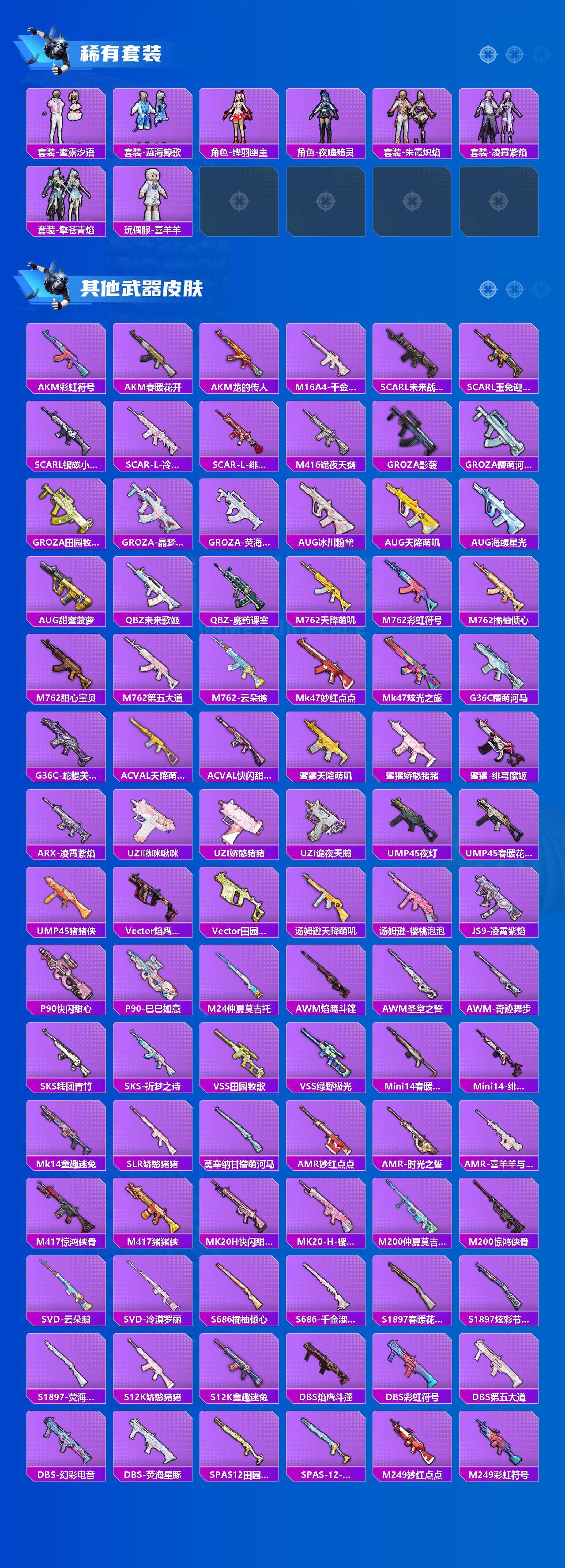 【粉色枪皮】:AKM-梦之光华,SCAR-L-锦绣绵绵,M416-心之恋语,M416-灵猫魔法师,蜜獾-荧海星豚,Vector-绯穹魔姬,Kar98K-巳巳如意,M417-第五大道,M200-梦海之灵,DP-28-千金淑猫,DP-28-豹影疾电