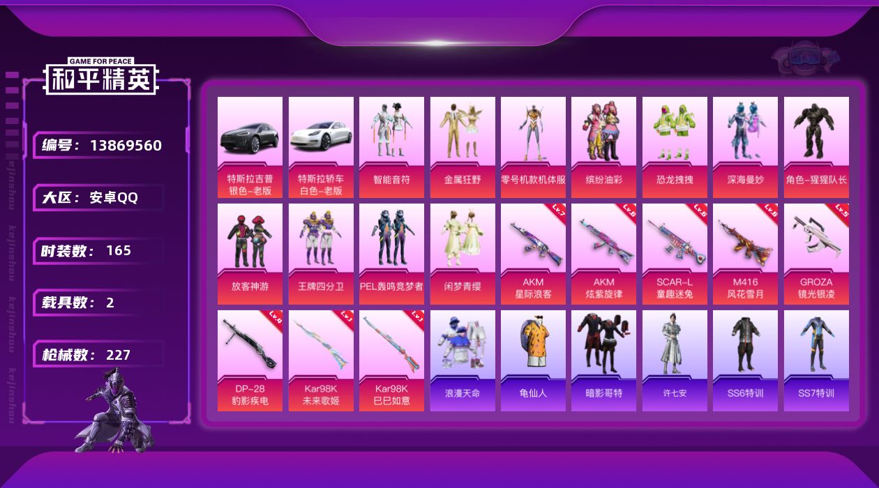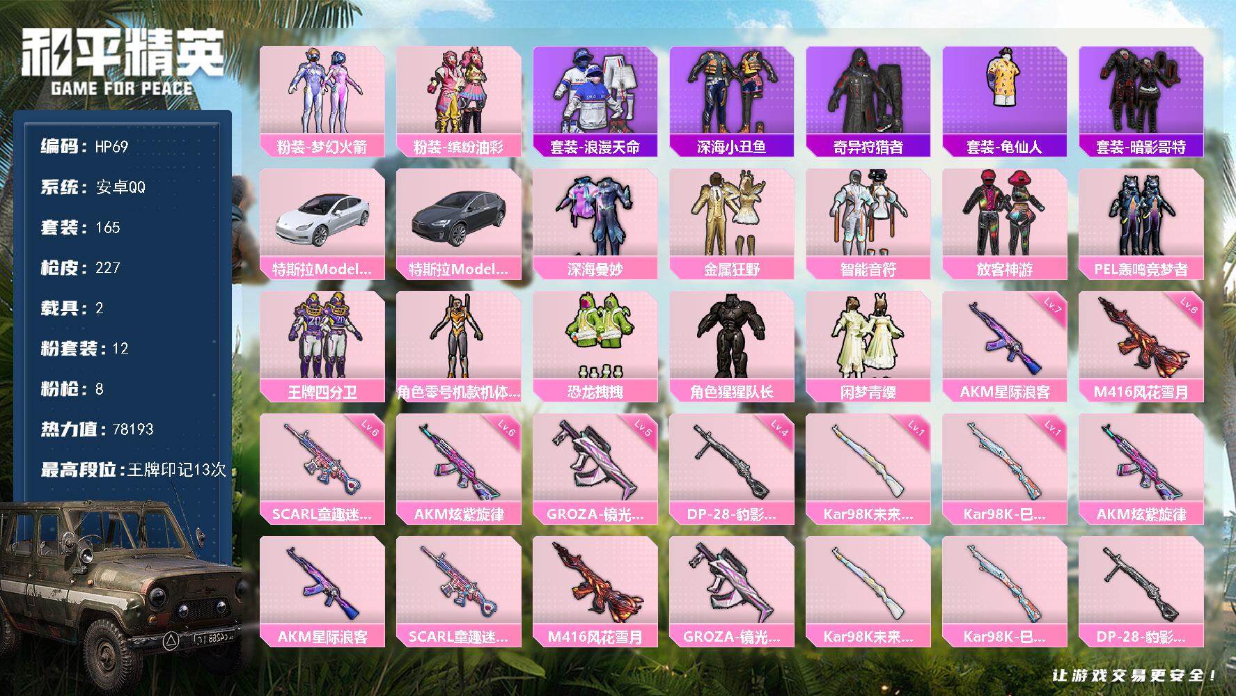 [13869560]安卓 手Q-12粉装-8特效枪-2载具-3粉色飞行器-78193热力值-13王牌印记-165套装-227枪皮 【热门品类】:粉装-梦幻火箭,粉装-缤纷油彩,套装-浪漫天命,套装-深海小丑鱼,套装-奇异狩猎者,套装-龟仙人,套装-暗影哥特 【粉色载具】:特斯拉Model 3(珍珠白),特斯拉Model X(冷光银) 【粉色套装】:粉装-深海曼妙,粉装-梦幻火箭,粉装-金属狂野,粉装-智能音符,粉装-缤纷油彩,粉装-放客神游,粉装-PEL轰鸣竞梦者,粉装-王牌四分卫,角色-零号机款机体服,粉装-恐龙拽拽,角色-猩猩队长,粉装-闲梦青缨 【粉色枪皮等级】:AKM-炫紫旋律(六级),AKM-星际浪客(七级),SCAR-L-童趣迷兔(六级),M416-风花雪月(六级),GROZA-镜光银凌(五级),Kar98K-未来歌姬(一级),Kar98K-巳巳如意(一级),DP-28-豹影疾电(四级) 【粉色枪皮】:AKM-炫紫旋律,AKM-星际浪客,SCAR-L-童趣迷兔,M416-风花雪月,GROZA-镜光银凌,Kar98K-未来歌姬,Kar98K-巳巳如意,DP-28-豹影疾电 【粉色飞行器】:深海曼妙飞行器,神秘黑猫飞行器,马卡龙飞行器 【粉色降落伞】:深海曼妙降落伞,梦幻火箭降落伞,炫紫旋律降落伞,PEL轰鸣竞梦者降落伞,神秘黑猫降落伞,甜蜜誓约降落伞,锦绣火鲤降落伞,暗夜玫瑰降落伞,蓝莓炮弹降落伞,环太平洋降落伞,暗夜鎏金降落伞,未来歌姬降落伞,江南烟雨降落伞 【稀有套装】:套装-龟仙人,角色-许七安 【稀有枪皮】:AKM-PEL轰鸣竞梦者,AKM-奇异狩猎者,AKM-彩虹符号,AKM-灼热熔岩,AKM-环太平洋,AKM-萌趣颜团子,AKM-霓虹街区,AKM-龙的传人,M16A4-红色方程式,SCAR-L-炫彩节奏,SCAR-L-玉兔迎春,SCAR-L-生命誓言,SCAR-L-银碳小老虎,SCAR-L-黄金龙骨,M416-动感兔斯基,M416-夜灯,M416-潮汐统领,M416-神秘黑猫,M416-糯团青竹,M416-红色方程式,M416-蓝色火焰,GROZA-异彩先驱,GROZA-彩虹符号,GROZA-懵萌河马,GROZA-治愈之星,GROZA-田园牧歌,GROZA-蓝莓炮弹,AUG-耀粉歌者,AUG-青春冒险家,QBZ-原初圣火,QBZ-彩虹符号,QBZ-未来歌姬,QB
