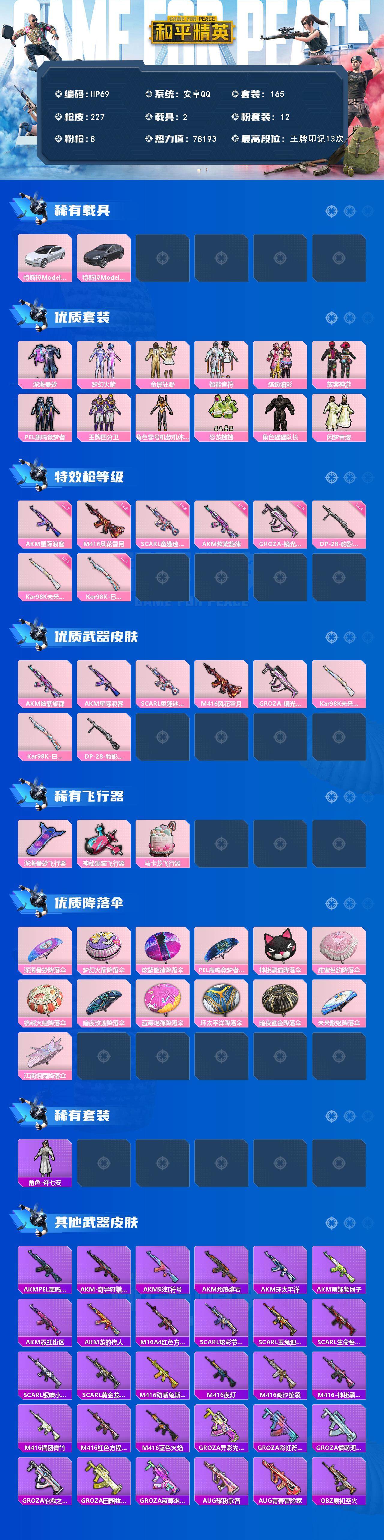 [13869560]安卓 手Q-12粉装-8特效枪-2载具-3粉色飞行器-78193热力值-13王牌印记-165套装-227枪皮