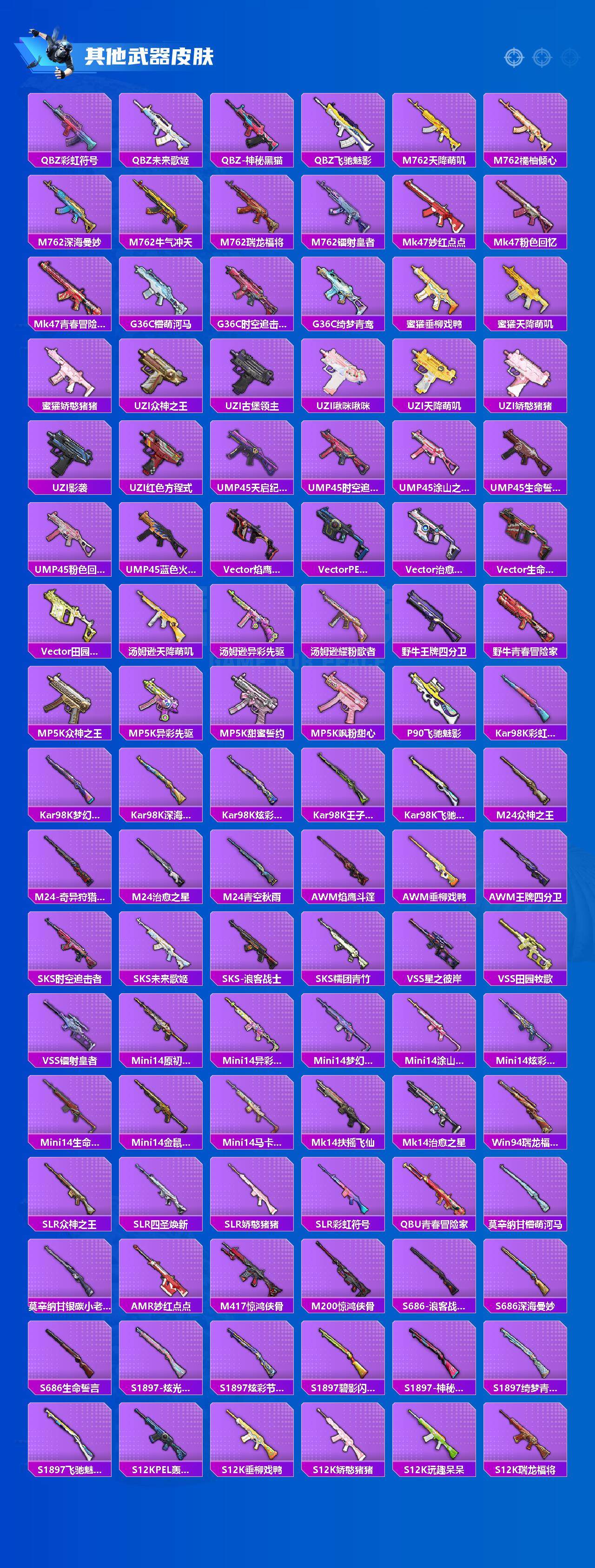 【稀有枪皮】:AKM-PEL轰鸣竞梦者,AKM-奇异狩猎者,AKM-彩虹符号,AKM-灼热熔岩,AKM-环太平洋,AKM-萌趣颜团子,AKM-霓虹街区,AKM-龙的传人,M16A4-红色方程式,SCAR-L-炫彩节奏,SCAR-L-玉兔迎春,SCAR-L-生命誓言,SCAR-L-银碳小老虎,SCAR-L-黄金龙骨,M416-动感兔斯基,M416-夜灯,M416-潮汐统领,M416-神秘黑猫,M416-糯团青竹,M416-红色方程式,M416-蓝色火焰,GROZA-异彩先驱,GROZA-彩虹符号,GROZA-懵萌河马,GROZA-治愈之星,GROZA-田园牧歌,GROZA-蓝莓炮弹,AUG-耀粉歌者,AUG-青春冒险家,QBZ-原初圣火,QBZ-彩虹符号,QBZ-未来歌姬,QB