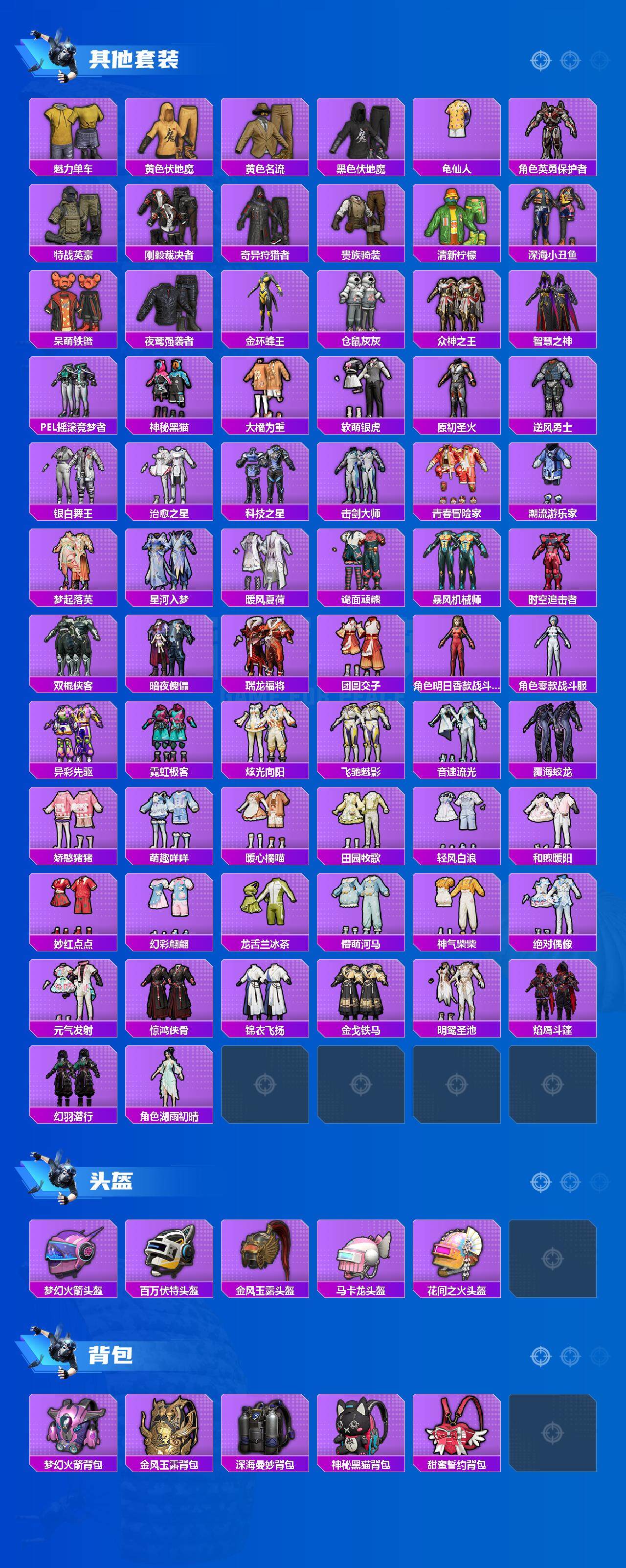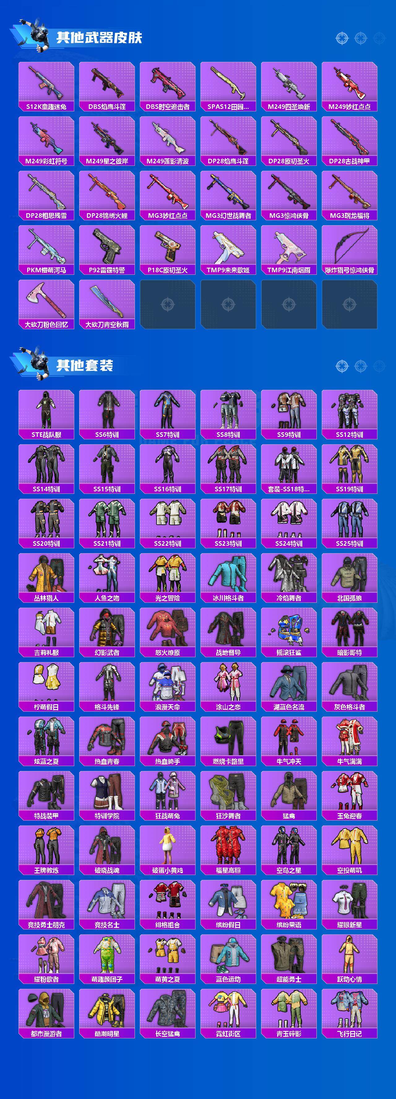 - [11772374]2粉装 5特效枪 1载具 15印记 可二次 可修改实名 身法装备:舞王派对(派对舞王、小金鞋),暗影哥特(红眼罩) 优质装备:兰博基尼Estoque(银翼灰),舞王派对(派对舞王、小金鞋),M416五爪金龙,快乐主宰,向日葵(套装-向日葵先生),七级M416-五爪金龙,GROZA-镜光银凌,萨利娅,AUG-暖羊咩咩,Kar98K-巳巳如意 热门装扮:S1赛事上衣,蔷薇魔法师,万圣娃娃,梦魇先生,酷熊伴侣,深海小丑鱼,萌熊伴侣,派对舞王(小金鞋),绯红秘境 稀有枪皮:DP-28-豹影疾电 五级特效枪:五级GROZA-镜光银凌,五级Kar98K-巳巳如意,五级DP-28-豹影疾电,五级AUG-暖羊咩咩 紫色装扮:SS22特训,SS23特训,幻彩翩翩,妙红点点,浪漫假日,SS31特训套装,冰凉西瓜,SS2特训,SS4特训,SS5特训,云霄猎人,人气偶像,光速穿梭者,六六大吉,冰川特警,决胜时刻,凛冬战士,刚毅裁决者,北国孤狼,午夜朋克,SS30特训套装,SS33特训套装,青涩时光,5.56爱好者,青春冒险家,潮流游乐家,SS15特训,时空追击者,暴风机械师,SS16特训,爆裂葡萄,萌趣颜团子,特种颜团子,飞驰魅影,音速流光,SS19特训,吉莉礼服,瑞龙福将,团圆交子,SS17特训,SS18特训,向日葵先生,阳光火鸡,都市漫游者,酒红色名流,酷潮明星,金鼠迎春,长空猛禽,雪山征服者,雪山精英,雪鹰学院,霓虹极客,霓虹街区,霸义无双,青年教官,迎春赐吉,缤纷果语,蓝彩潮人,蓝色守护者,蓝色运动,虎虎生威吉莉,血色贵族,超能勇士,跃动心情,骑行爱好者,魅力单车,黄色伏地魔,黄色名流,黄色格斗者,黄色运动,黎明保卫者,黑色伏地魔,龙的传人,龟仙人,香桃花海,熔岩游骑兵连帽夹克,缤纷假日,极地朋克,柠萌假日,橘黑制服,沙漠兵团,派对绅士,涂山之恋,深蓝色名流,清新柠檬,滨海假日,幻影武者,圣诞大吉,坚韧舞者,夏日音浪,夜莺强袭者,完美偶像,帅气教官,幻世保卫者,怒火燎原,战地英姿,战地菁英,战地领军,湖蓝色名流,滨海厨神,绮丽涂鸦,甜蜜菠萝,生化防暴队,疯狂小兔子,白熊同盟,白色伏地魔,破晓战魂,破蛋小黄鸡,碟中谍A款,甜蜜告白,游猎者,福星高照,空岛之星,空投萌叽,竞技勇士朋克,竞技达人朋克,紧急救援,红色运动,甜蜜熊情侣,王牌教练,牛气冲天,灰色格斗者,炫蓝之夏,热血青春,