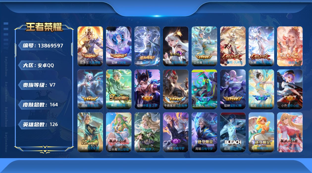 - [11530368]V7 1典藏 1珍品传说 11传说 105英雄 192皮肤 可修改实名 荣耀水晶:弑枪猎影(韩信典藏) 珍品传说:朽木白哉 传说皮:仲夏夜之梦(大飞蛾),地狱之眼,绛天战甲(鸡嘴战神),碎云,画中仙,记忆之芯(机甲兔),百相守梦(张飞),电玩·雷克斯,鲁班七号-时之奇旅 珍宝阁皮:优雅恋人 限定皮:鸣野蒿,至尊宝,诗剑行,五谷丰年,云端筑梦师 史诗皮:赞萌露比,鸭鸭历险记-刘禅,龙之律动,石田雨龙,涂山红红,东方月初,怒海争锋,蔬乡物语(鲁班七号),百相守梦-周瑜,破空之剑,遇见神鹿,紫霞仙子,苍穹之光,电玩小子(小书包),白龙吟,黄金分割率,特工魅影,千年之狐,鹤归松栖(赵怀真),电玩·兔顽号,江河有灵,高渐离燃音魔法,百解令(蒙犽),蒙恬荣光圣徽,冰冠公主,青蛇,偶像歌手,晚萤,电玩·爆裂旋风,百相守梦(刘备),百相守梦(关羽),龙骑士(小龙虾),末日机甲-吕布,猫狗日记-孙策,猫狗日记-大乔,时之恋人-孙尚香,乱世虎臣,节奏热浪,女仆咖啡,摇滚巨星,水果甜心,天才门将,星夜王子,心灵骇客,德古拉伯爵,暗隐猎兽者,鬼剑武藏,乐园奇幻夜,地狱岩魂,纤云弄巧,拒霜思,缤纷独角兽,乘风破浪,逐浪之夏,水晶猎龙者,箭羽风息,金属风暴,圣诞恋歌,鹰眼统帅,魅力维加斯,无心