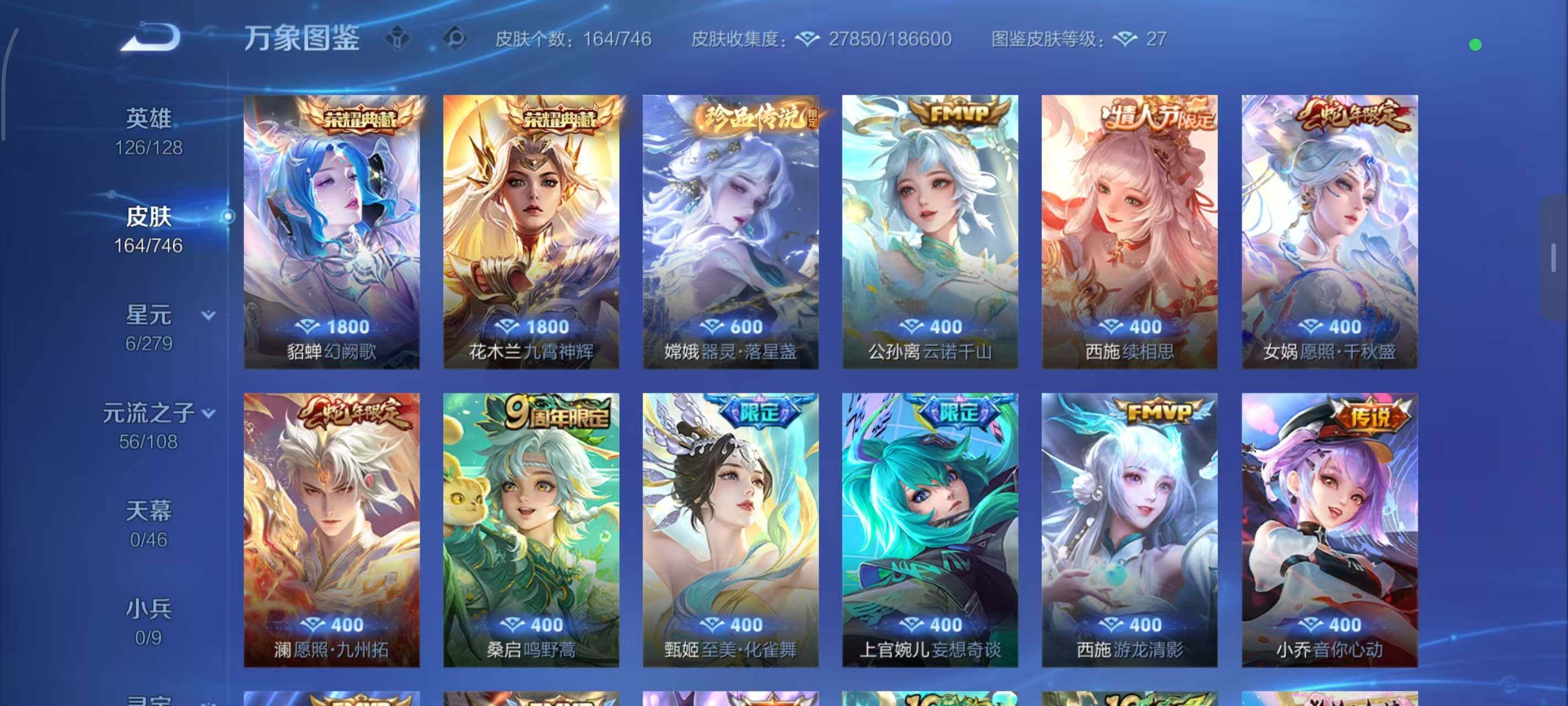 裴擒虎李小龙,上官婉儿梁祝,上官婉儿天狼绘梦者,嫦娥如梦令,公孙离玉兔公主,西施至美·乘鲤谣,甄姬至美·化雀舞,桑启鸣野蒿,澜愿照·九州拓,女娲愿照·千秋盛