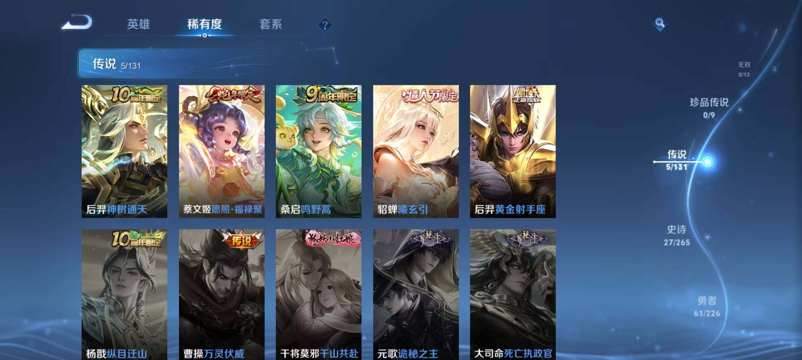 【传说皮肤】:后羿神树通天,蔡文姬愿照福禄聚,桑启鸣野蒿,貂蝉曦玄引,后羿黄金射手座