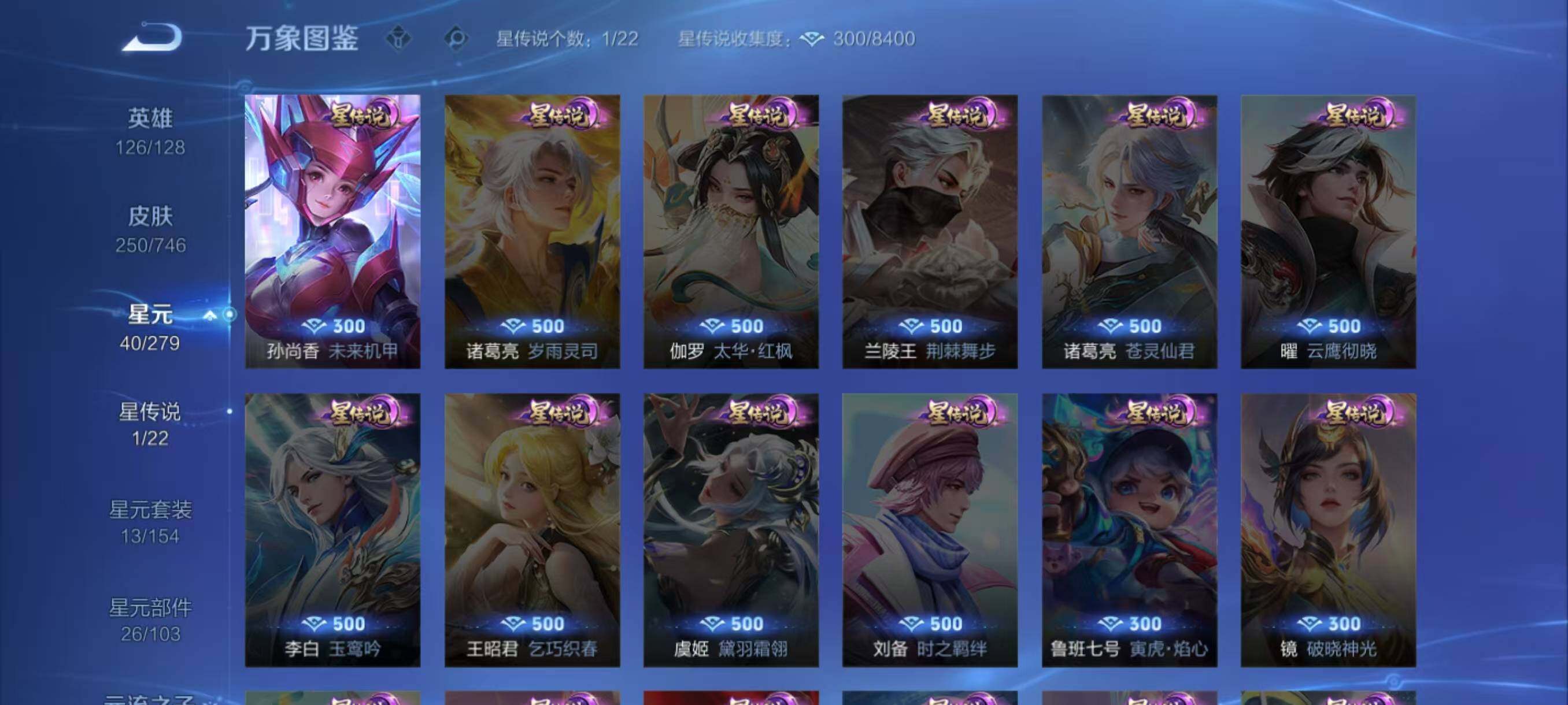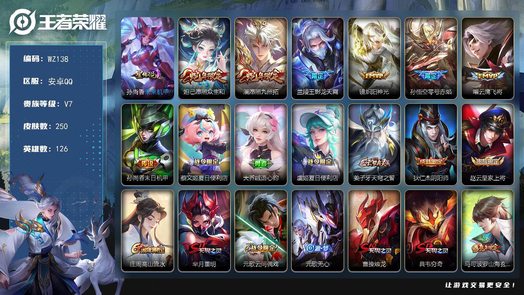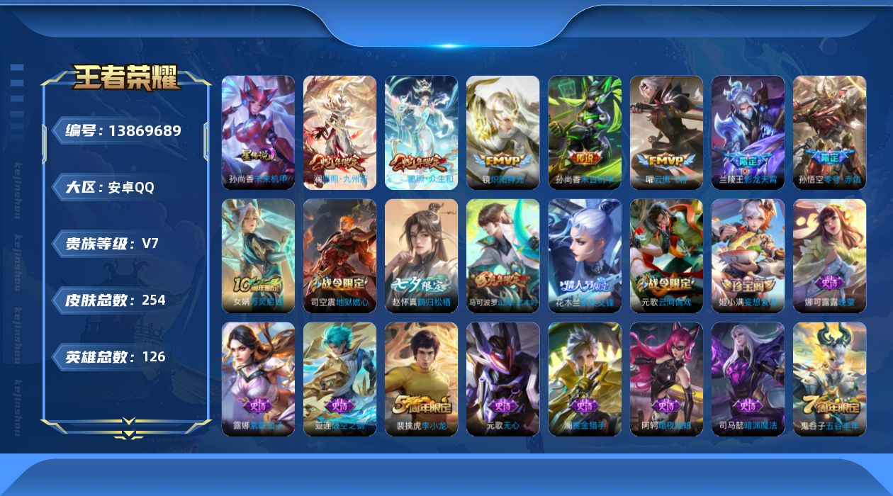 - [11688581]V7 1典藏 10传说 124英雄 235皮肤 可修改实名 优质装备:全息碎影(猴子典藏),冠军飞将,末日机甲-孙尚香(绿蚂蚱),地狱火,仲夏夜之梦(大飞蛾),超时空战士-狄仁杰 珍宝阁皮:优雅恋人 限定皮:白虎志(电光耗子),凤求凰(白切鸡),太华(伽罗年限),梅西,武陵仙君(小桃花),神威(电光马子),遇见飞天,游园惊梦,梁祝,御风骁将(吕布年限),龙胆,逐梦之翼,李小龙,逐梦之影,朱雀志(守约年限),永曜之星,辉光之辰,如梦令-嫦娥,如梦令-后羿,一生所爱,大圣娶亲,寅虎·心曲(虎婆) 史诗皮:化蝶舞,龙之律动,藏狐·褐绒,茶境仙,紫霞仙子,苍穹之光,电玩小子(小书包),黄金分割率,特工魅影,千年之狐,江河有灵,蒙恬荣光圣徽,无限星赏官,电玩·爆裂旋风,乱世虎臣,摇滚巨星,水果甜心,星夜王子,德古拉伯爵,暗隐猎兽者,鬼剑武藏,乐园奇幻夜,舞动绿茵,地狱岩魂,纤云弄巧,繁星吟游(呼啦呼啦),拒霜思,乘风破浪,逐浪之夏,水晶猎龙者,曙光守护者,金属风暴,原初追逐者,圣诞狂欢,圣诞恋歌,鹰眼统帅,暗夜贵公子,魅力维加斯,黎明之约,无心,未来纪元-赵云