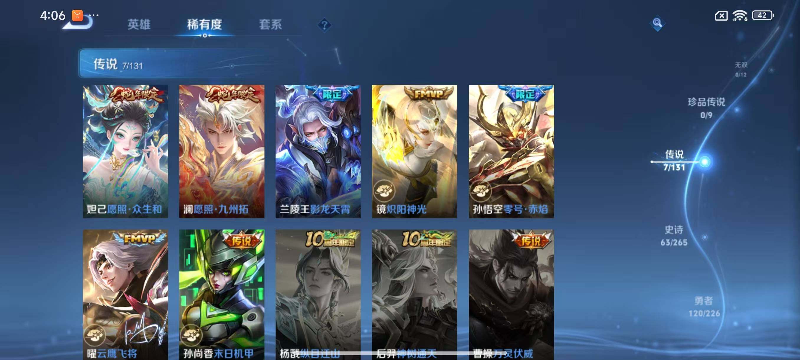 【传说皮肤】:妲己愿照众生和,澜愿照九州拓,兰陵王影龙天霄,镜炽阳神光,孙悟空零号赤焰,曜云鹰飞将,孙尚香末日机甲