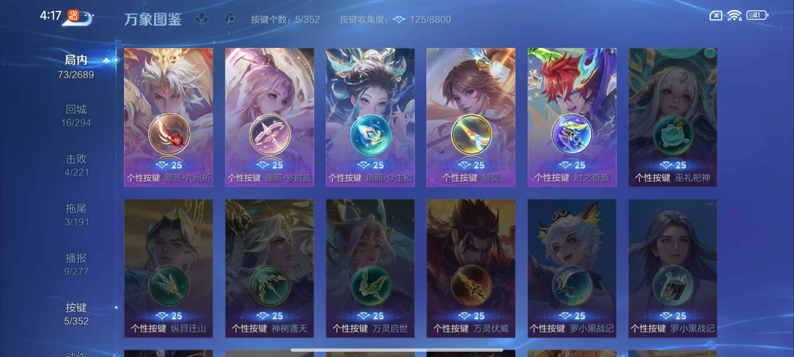 【其他皮肤】:项羽海滩派对,韩信教廷特使,赵云白执事,芈月红桃皇后,武则天东方不败,孙膑天使之翼,妲己少女阿狸,典韦黄金武士,达摩拳王,花木兰兔女郎,狄仁杰阴阳师,刘备纽约教父,关羽龙腾万里,孙尚香沉稳之力,狂铁特工战影,鲁班大师乓乓大师,桑启海盐诗旅,裴擒虎擒涛扼浪,太乙真人劲辣红锅,鲁班大师探海日志,李元芳妄想特派,张良古海寻踪,鬼谷子天穹祈灯,沈梦溪龙舞盛年,刘邦剑破天穹,程咬金群星魔术团,姜子牙天穹之誓,盘古敬我三分,东皇太一噬灭天穹,干将莫邪雾都夜雨,太乙真人谧流熔炉,西施雪境奇遇,达摩爆裂喵拳,明世隐景韶洛都,戈娅玫蓝誓约,刘备浪漫序章,鲁班七号木偶奇遇记,花木兰剑舞者,张良一千零一夜,孙悟空西部大镖客,后羿精灵王,兰陵王隐刃,马可波罗激情绿茵,杨戬埃及法老,明世隐占星师,元歌午夜歌剧院,伽罗花见巫女,李信灼热之刃,嫦娥露花倒影,盘古创世神祝