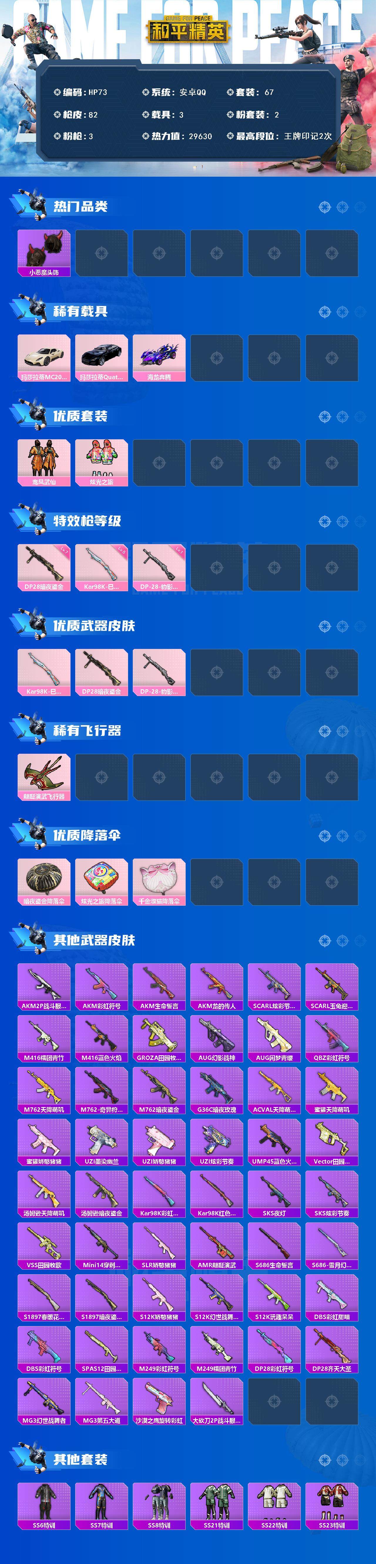 [13869745]安卓 手Q-2粉装-3特效枪-3载具-1粉色飞行器-29630热力值-2王牌印记-67套装-82枪皮 【热门品类】:小恶魔头饰 【粉色载具】:玛莎拉蒂MC20(星石白),玛莎拉蒂Quattroporte(夜幕蓝),海龙奔腾 【粉色套装】:粉装-鸾凤武仙,粉装-炫光之旅 【粉色枪皮等级】:Kar98K-巳巳如意(五级),DP-28-暗夜鎏金(七级),DP-28-豹影疾电(一级) 【粉色枪皮】:Kar98K-巳巳如意,DP-28-暗夜鎏金,DP-28-豹影疾电 【粉色飞行器】:翩跹演武飞行器 【粉色降落伞】:暗夜鎏金降落伞,炫光之旅降落伞,千金淑猫降落伞 【稀有枪皮】:AKM-2P战斗服款,AKM-彩虹符号,AKM-生命誓言,AKM-龙的传人,SCAR-L-炫彩节奏,SCAR-L-玉兔迎春,M416-糯团青竹,M416-蓝色火焰,GROZA-田园牧歌,AUG-幻影战神,AUG-闲梦青缨,QBZ-彩虹符号,M762-天降萌叽,M762-奇异狩猎者,M762-暗夜鎏金,G36C-暗夜玫瑰,AC-VAL-天降萌叽,蜜獾-天降萌叽,蜜獾-娇憨猪猪,UZI-墨染幽兰,UZI-娇憨猪猪,UZI-炫彩节奏,UMP45-蓝色火焰,Vector-田园牧歌,汤姆逊-天降萌叽,汤姆逊-暗夜鎏金,Kar98K-彩虹符号,Kar98K-红色方程式,SKS-夜灯,SKS-炫彩节奏,VSS-田园牧歌,Mini14-穿刺龙虾,SLR-娇憨猪猪,AMR-翩跹演武,S686-生命誓言,S686-雪月幻音,S1897-春暖花开,S1897-暗夜鎏金,S12K-玩趣呆呆,S12K-娇憨猪猪,S12K-幻世战舞者,DBS-彩虹甜喵,DBS-彩虹符号,SPAS-12-田园牧歌,M249-彩虹符号,M249-糯团青竹,DP-28-彩虹符号,DP-28-齐天大圣,MG3-幻世战舞者,MG3-第五大道,沙漠之鹰-旋转彩虹,大砍刀-2P战斗服款 【其他套装】:套装-SS6特训,套装-SS7特训,套装-SS8特训,套装-SS21特训,套装-SS22特训,套装-SS23特训,套装-SS24特训,套装-SS25特训,套装-SS26特训,套装-SS28特训,套装-光之冒险,套装-冷焰舞者,套装-北国孤狼,套装-幻世战舞者,套装-幻影武者,套装-春日漫步,套装-柠萌假日,套装-海岛探路者,套装-海滨突袭者,套装-猎鹰,套装-疯狂