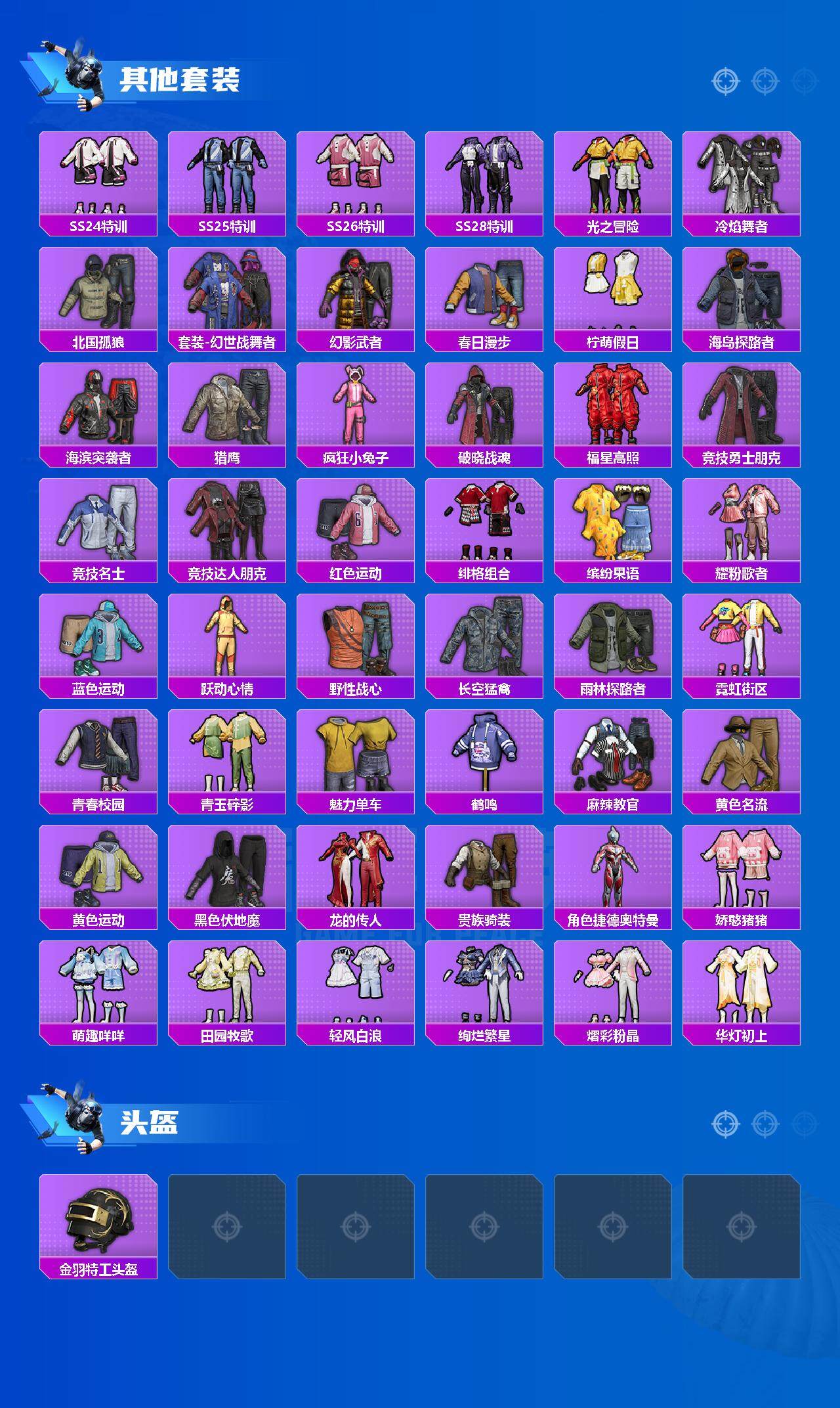 【其他套装】:套装-SS6特训,套装-SS7特训,套装-SS8特训,套装-SS21特训,套装-SS22特训,套装-SS23特训,套装-SS24特训,套装-SS25特训,套装-SS26特训,套装-SS28特训,套装-光之冒险,套装-冷焰舞者,套装-北国孤狼,套装-幻世战舞者,套装-幻影武者,套装-春日漫步,套装-柠萌假日,套装-海岛探路者,套装-海滨突袭者,套装-猎鹰,套装-疯狂