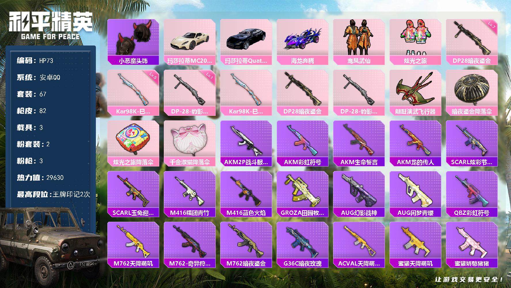 [13869745]安卓 手Q-2粉装-3特效枪-3载具-1粉色飞行器-29630热力值-2王牌印记-67套装-82枪皮