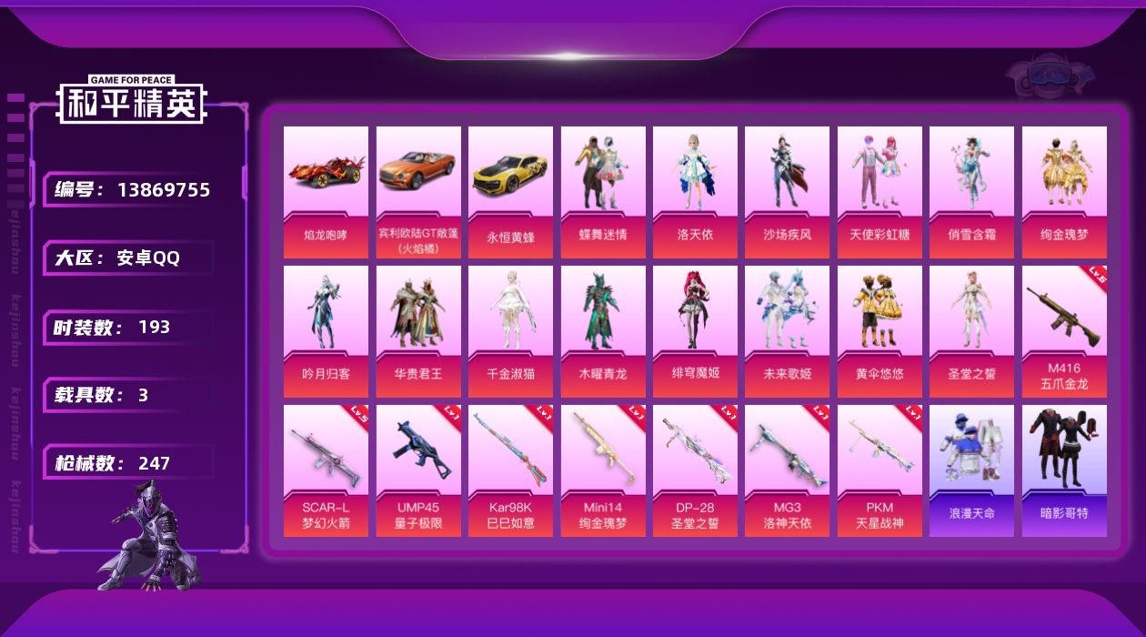 - PX_2081553-实名: 可修改 时装数: 569 载具数: 4 枪械数: 242 战备数: 169 神级装扮: 金蛇镇世-烛九【3级】 热门装扮: 万圣娃娃,银刃赛罗,洛天依,炫光之旅,暗夜魅影,宙之时溯,星云暗核,千金淑猫,星穹咏叹调 载具: 赤兔,照夜玉狮子,护世瑞兽,辉羽雀灵自行车 稀有枪皮: MG3洛神天依【7级】,M416风花雪月【7级】,M249蓝莓炮弹【7级】,Kar98k绿意
