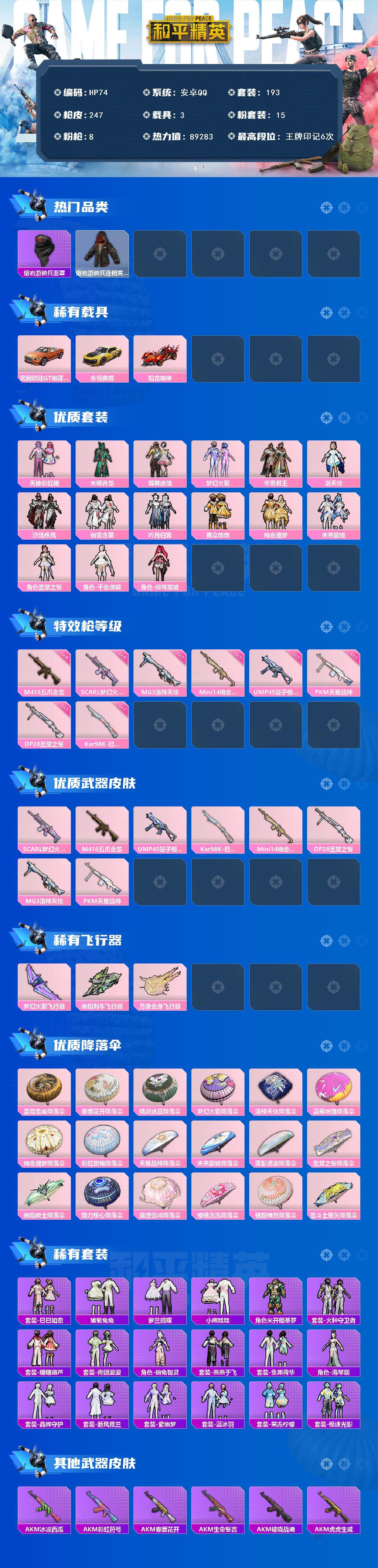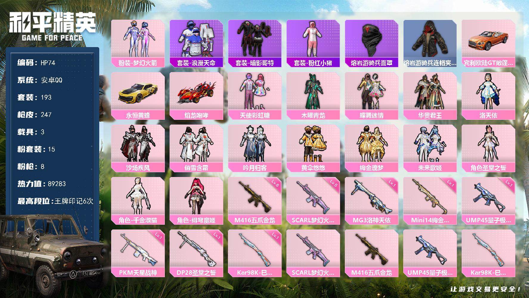[13869755]安卓 手Q-15粉装-8特效枪-3载具-4粉色飞行器-89283热力值-6王牌印记-193套装-247枪皮 【热门品类】:粉装-梦幻火箭,套装-浪漫天命,套装-暗影哥特,套装-粉红小猪,熔岩游骑兵面罩,熔岩游骑兵连帽夹克 【粉色载具】:宾利欧陆GT敞篷(火焰橘),永恒黄蜂,焰龙咆哮 【粉色套装】:粉装-天使彩虹糖,粉装-木曜青龙,粉装-蝶舞迷情,粉装-梦幻火箭,粉装-华贵君王,角色-洛天依,粉装-沙场疾风,粉装-俏雪含霜,粉装-吟月归客,粉装-黄伞悠悠,粉装-绚金瑰梦,粉装-未来歌姬,角色-圣堂之誓,角色-千金淑猫,角色-绯穹魔姬 【粉色枪皮等级】:SCAR-L-梦幻火箭(五级),M416-五爪金龙(六级),UMP45-量子极限(一级),Kar98K-巳巳如意(一级),Mini14-绚金瑰梦(一级),DP-28-圣堂之誓(一级),MG3-洛神天依(一级),PKM-天星战神(一级) 【粉色枪皮】:SCAR-L-梦幻火箭,M416-五爪金龙,UMP45-量子极限,Kar98K-巳巳如意,Mini14-绚金瑰梦,DP-28-圣堂之誓,MG3-洛神天依,PKM-天星战神 【粉色飞行器】:梦幻火箭飞行器,幽焰列车飞行器,万象金身飞行器 【粉色降落伞】:至尊龙雀降落伞,春暖花开降落伞,精灵迷巫降落伞,梦幻火箭降落伞,洛神天依降落伞,蓝莓炮弹降落伞,绚金瑰梦降落伞,彩虹甜喵降落伞,天星战神降落伞,未来歌姬降落伞,莲影清波降落伞,圣堂之誓降落伞,幽焰骑士降落伞,动力核心降落伞,盛世惊鸿降落伞,樱桃泡泡降落伞,桃粉嫣然降落伞,圣斗士星矢降落伞 【稀有套装】:套装-巳巳如意,套装-雏菊兔兔,套装-萝兰蝴蝶,套装-小熊娃娃,角色-米开朗基罗,套装-火种守卫者,套装-糖糖葫芦,套装-青团波波,角色-俏兔智灵,套装-燕燕于飞,套装-鱼渊荷华,角色-海琴烟,套装-晶辉守护,套装-新风雅兰,套装-紫幽梦,套装-蓝冰羽,套装-果冻柠檬,套装-极速光影 【稀有枪皮】:AKM-冰凉西瓜,AKM-彩虹符号,AKM-春暖花开,AKM-生命誓言,AKM-破晓战魂,AKM-虎虎生威,M16A4-生命誓言,SCAR-L-炫彩节奏,SCAR-L-玉兔迎春,SCAR-L-生命誓言,SCAR-L-黄金龙骨,SCAR-L-龙宫之主,M416-糯团青竹,M416-红色方程式,M416-蓝色火焰,GROZA-异彩先驱,G