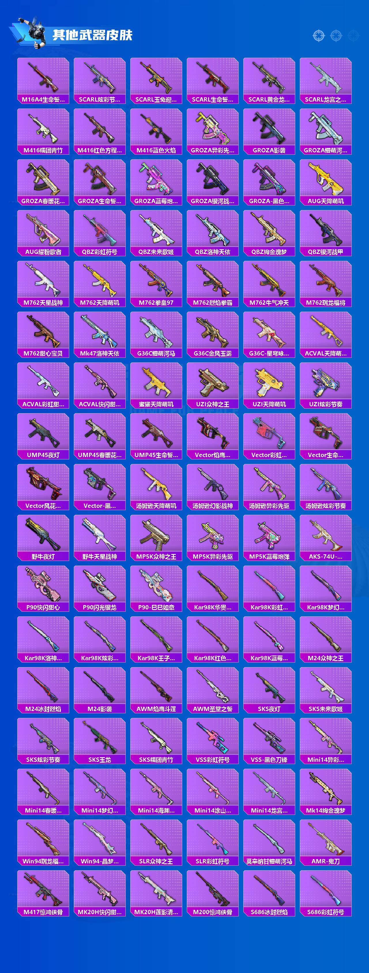 【稀有枪皮】:AKM-冰凉西瓜,AKM-彩虹符号,AKM-春暖花开,AKM-生命誓言,AKM-破晓战魂,AKM-虎虎生威,M16A4-生命誓言,SCAR-L-炫彩节奏,SCAR-L-玉兔迎春,SCAR-L-生命誓言,SCAR-L-黄金龙骨,SCAR-L-龙宫之主,M416-糯团青竹,M416-红色方程式,M416-蓝色火焰,GROZA-异彩先驱,G