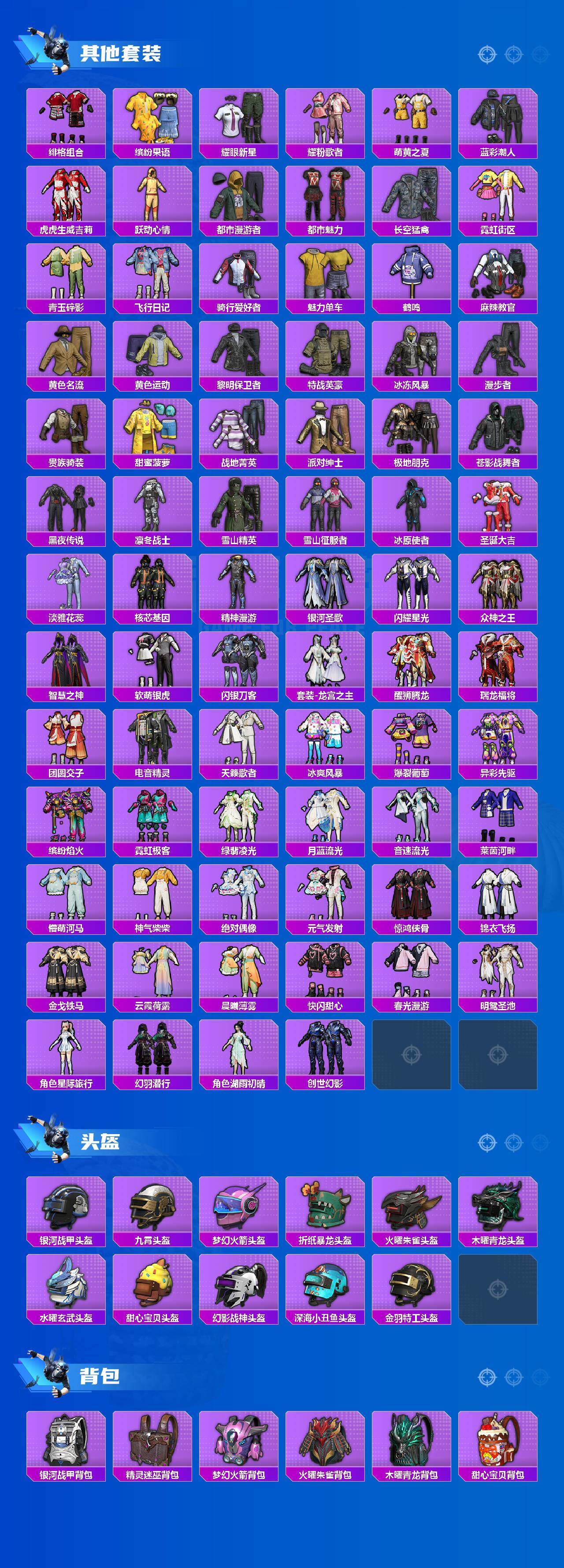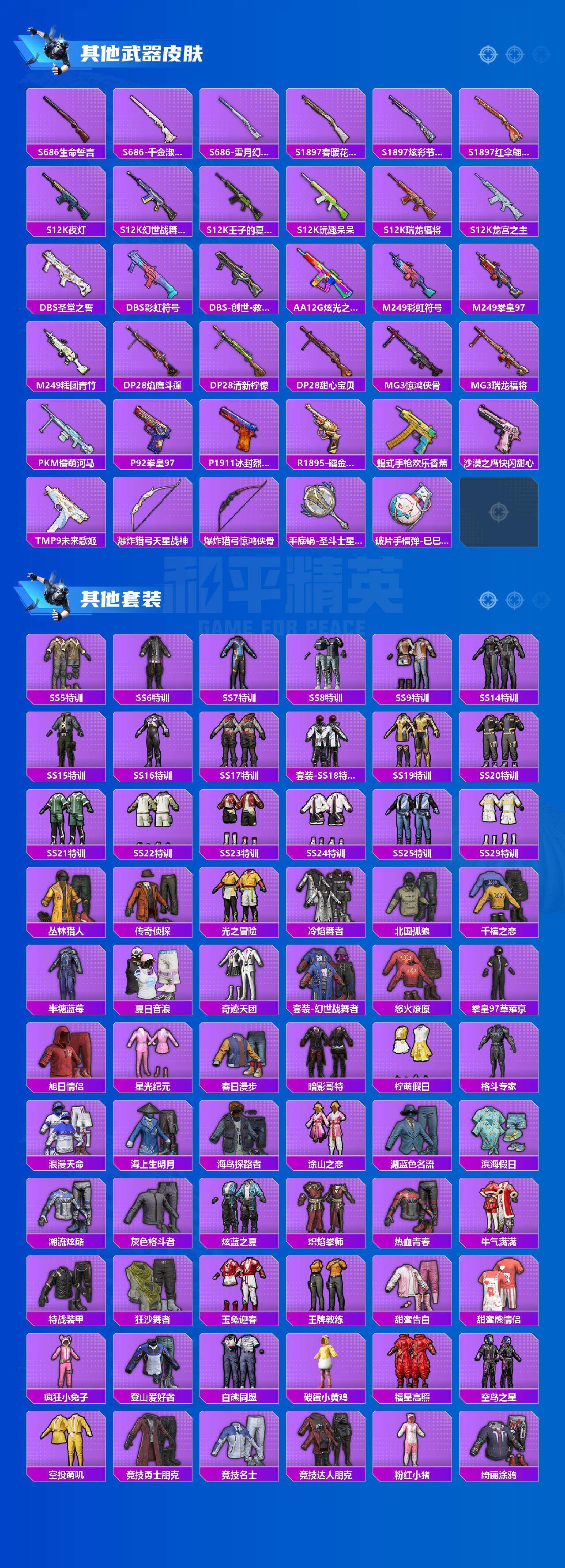 - [11676051]5粉装 2特效枪 2载具 11印记 可二次 可修改实名 身法装备:Mark.06(新蓝螳螂) 优质装备:时空跃影(星辉银),兰博基尼Estoque(银翼灰),锦绣火鲤,扶摇飞仙,星穹咏叹调,Kar98K-巳巳如意 热门装扮:蓝莓炮弹,金域紫灵,暗夜魅影 稀有枪皮:DP-28-豹影疾电 五级特效枪:五级Kar98K-巳巳如意,五级DP-28-豹影疾电 紫色装扮:SS21特训,SS31特训套装,SS5特训,人气偶像,军械专家,冰川特警,冷焰舞者,北国孤狼,千禧之恋,SS30特训套装,SS33特训套装,青涩时光,SS20特训,迪迦奥特曼,闪银刀客,时空追击者,暴风机械师,SS16特训,爆裂葡萄,银白舞王,SS13特训,SS14特训,SS19特训,吉莉礼服,瑞龙福将,团圆交子,醒狮腾龙,SS17特训,异彩先驱,SS18特训,都市魅力,酒红色名流,长空猛禽,雪山精英,霓虹极客,霓虹街区,青年教官,缤纷果语,蓝彩潮人,蓝色运动,虎虎生威吉莉,街头潮人,跃动心情,飞行日记,魅力单车,麻辣教官,黄色伏地魔,黄色名流,黄色运动,黑色伏地魔,龙的传人,冰河战士,龙魂突击队,蝶变,香桃花海,极速红龙,格斗先锋,橘黑制服,海岛探路者,深蓝色名流,幻影武者,娴静芝兰,夏日音浪,夜莺强袭者,完美偶像,帅气教官,幻世战舞者,怒火燎原,战地督导,战地菁英,探宝勇士,湖蓝色名流,绮丽涂鸦,疯狂小兔子,白色伏地魔,破晓战魂,破蛋小黄鸡,神秘领域,空投萌叽,竞技勇士朋克,竞技达人朋克,红色运动,甜蜜熊情侣,牛气冲天,热血青春,牛气满满,猛禽,猎鹰,镭射皇者,静谧青瓷,粉日山川,小熊娃娃,雏菊兔兔,萝兰蝴蝶,SS29特训,星途旅人,纯真浪花,热情海星,曼妙人鱼,SS28特训,Mark.06(新蓝螳螂),异域银装,石蕴玉辉,鱼渊荷华,玉兔迎春,燕燕于飞,都市丽猫,青团波波,糖糖葫芦,棉花软糖,竞技名士,街头风暴,怀庆长公主,SS25特训,SS27特训,SS26特训,智谋强哥,SS6特训,SS8特训,丝绸行者,神秘舞者,星渊小夜曲,粉甜马卡龙,原初圣火,逆风勇士,SS12特训,蓝甜马卡龙,辉星之火,耀粉歌者,海洋之心,深海来使,蓝冰羽,紫幽梦,SS32特训服(SS32特训套装),恋语绒绒 优质战备:创世·救赎降落伞,星途旅人降落伞,未来领航者降落伞,金丰海韵降落伞,千金淑猫降落伞,临安公主降落伞,扶摇飞仙降