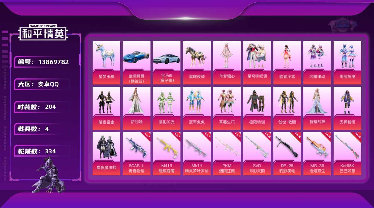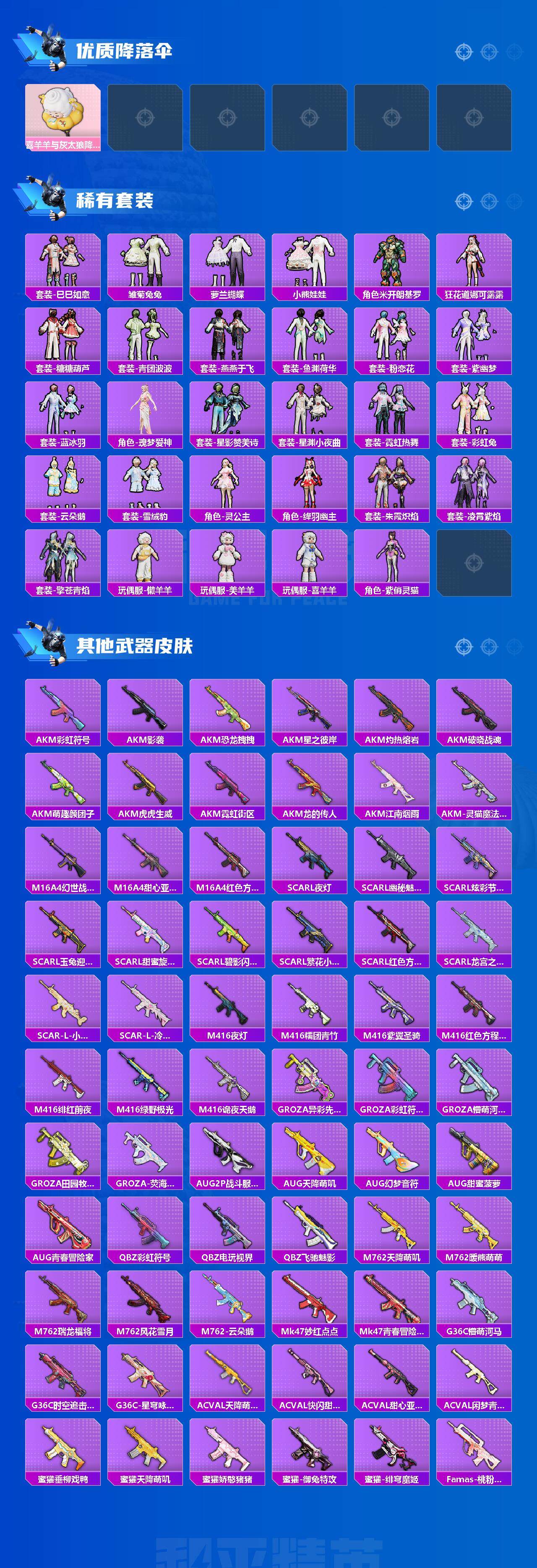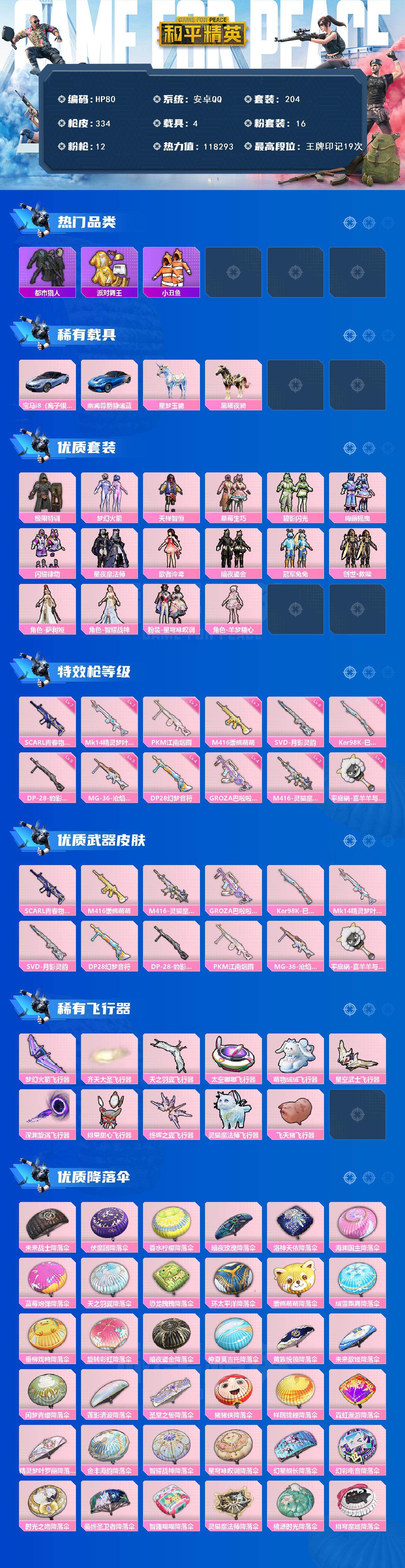 [13869782]安卓 手Q-16粉装-12特效枪-4载具-14粉色飞行器-118293热力值-19王牌印记-204套装-334枪皮 【热门品类】:粉装-梦幻火箭,套装-浪漫天命,套装-都市猎人,套装-派对舞王,套装-深海小丑鱼,套装-小丑鱼,套装-奇异狩猎者,套装-龟仙人,套装-暗影哥特,角色-Mark.06 【粉色载具】:宝马i8(离子银),幽澜尊爵(静谧蓝),星梦玉骢,黑曜夜骑 【粉色套装】:粉装-极限特训,粉装-梦幻火箭,粉装-天禅智恒,粉装-草莓生巧,粉装-碧影闪光,粉装-绚丽摇曳,粉装-闪耀律动,粉装-星夜魔法师,角色-歌者泠鸢,粉装-暗夜鎏金,粉装-冠军兔兔,套装-创世·救赎,角色-萨利娅,角色-智耀战神,粉装-星穹咏叹调,角色-羊梦糖心 【粉色枪皮等级】:SCAR-L-青春物语(七级),M416-暖熊萌萌(七级),M416-灵猫魔法师(三级),GROZA-巴啦啦小魔仙(四级),Kar98K-巳巳如意(五级),Mk14-精灵梦叶罗丽(七级),SVD-月影灵韵(六级),DP-28-幻梦音符(四级),DP-28-豹影疾电(五级),PKM-江南烟雨(七级),MG-36-沧焰双生(五级),平底锅-喜羊羊与灰太狼(三级) 【粉色枪皮】:SCAR-L-青春物语,M416-暖熊萌萌,M416-灵猫魔法师,GROZA-巴啦啦小魔仙,Kar98K-巳巳如意,Mk14-精灵梦叶罗丽,SVD-月影灵韵,DP-28-幻梦音符,DP-28-豹影疾电,PKM-江南烟雨,MG-36-沧焰双生,平底锅-喜羊羊与灰太狼 【粉色飞行器】:梦幻火箭飞行器,齐天大圣飞行器,天之羽翼飞行器,太空嘟嘟飞行器,萌物绒绒飞行器,星空武士飞行器,深渊漩涡飞行器,绯果甜心飞行器,终晖之翼飞行器,灵猫魔法师飞行器,飞天猪飞行器 【粉色降落伞】:未来战士降落伞,伏魔团降落伞,香水柠檬降落伞,暗夜玫瑰降落伞,洛神天依降落伞,海渊国主降落伞,蓝莓炮弹降落伞,天之羽翼降落伞,恐龙拽拽降落伞,环太平洋降落伞,暖熊萌萌降落伞,绒雪飘舞降落伞,垂柳戏鸭降落伞,旋转彩虹降落伞,暗夜鎏金降落伞,仲夏莫吉托降落伞,黄族统领降落伞,未来歌姬降落伞,闲梦青缨降落伞,莲影清波降落伞,圣堂之誓降落伞,猪猪侠降落伞,祥瑞锦鲤降落伞,霓虹漫游降落伞,精灵梦叶罗丽降落伞,金丰海韵降落伞,智耀战神降落伞,星穹咏叹调降落伞,幻星舰长降落伞,幻彩电音降落伞,时