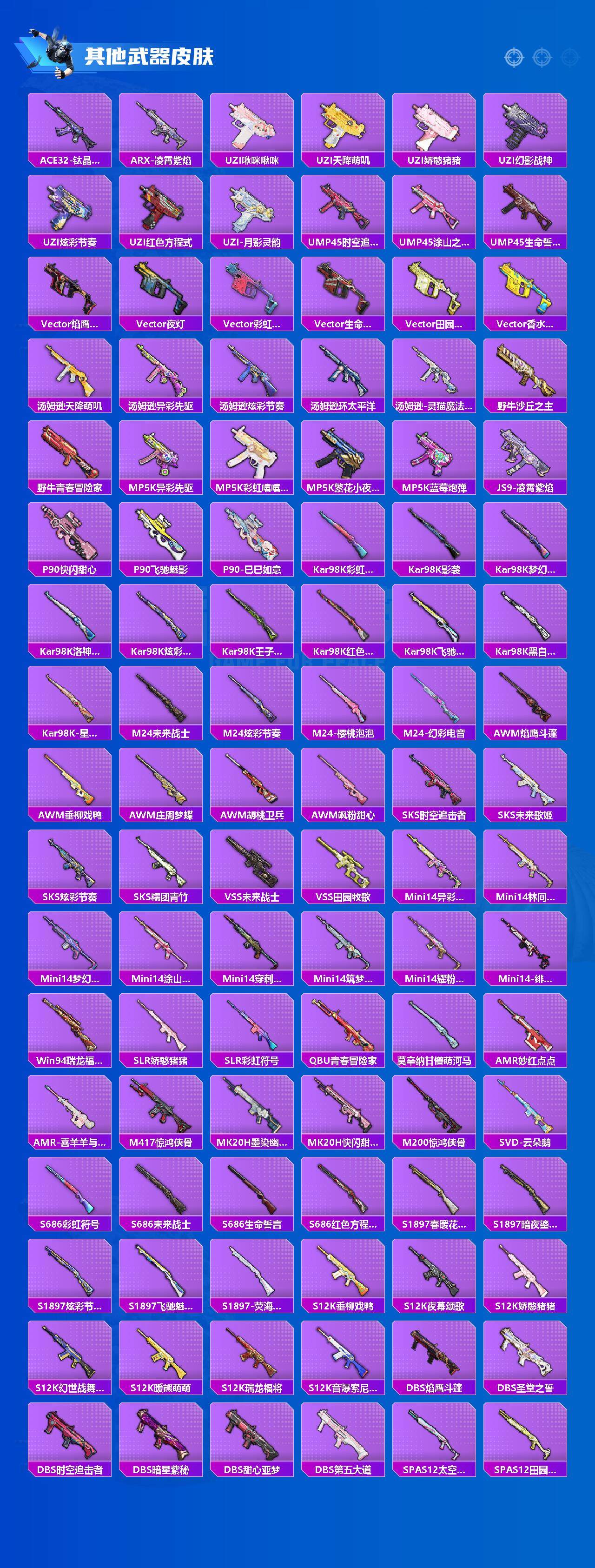 【粉色枪皮】:SCAR-L-青春物语,M416-暖熊萌萌,M416-灵猫魔法师,GROZA-巴啦啦小魔仙,Kar98K-巳巳如意,Mk14-精灵梦叶罗丽,SVD-月影灵韵,DP-28-幻梦音符,DP-28-豹影疾电,PKM-江南烟雨,MG-36-沧焰双生,平底锅-喜羊羊与灰太狼