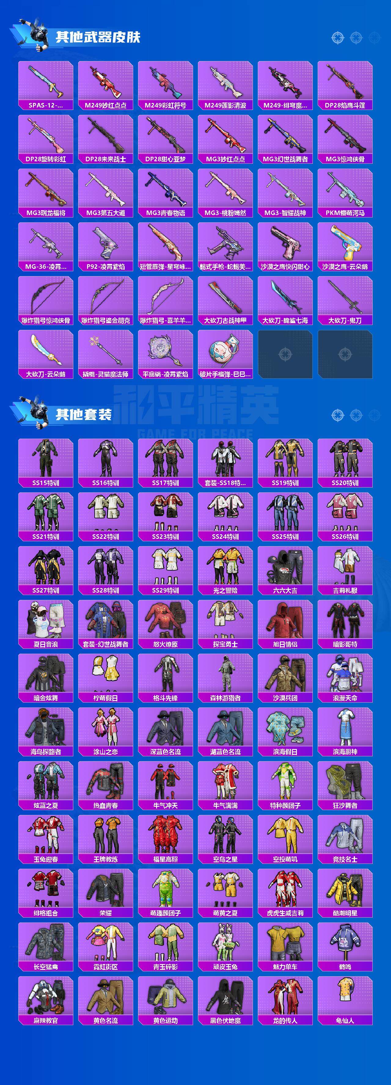 - [10822365]WBDS0035 苹果Q 227套装321枪皮1神装7粉装5载具10特效枪 兰博轿车灰色 阿斯顿马丁S绿色 特斯拉R水滴蓝 合金龙骨蓝色 星梦玉骢 沙丘之主-图卡盟 (2级) 木乃伊 奇异狩猎者 AWM-黄金龙骨 AKM-百万伏特 都市猎人 浪漫天命 梦幻火箭 绯穹魔姬 宝贝奶油派 炫光之旅 第五大道 香水柠檬 暗夜玫瑰 M416-五爪金龙 (7级) M416-心之恋语 (7级) M416-墨龙九天 (3级) AKM-炫紫旋律 (7级) Kar98K-巳巳如意 (5级) DP-28-豹影疾电 (5级) AUG-暖羊咩咩 (5级) AUG-星梦奇缘 (3级) Mk14-甜梦熊击 (5级) SCAR-L-机甲封神 (7级) 龙翔九天飞行器 神秘黑猫飞行器 齐天大圣飞行器 潮萌小黄鸭 鹰眼刺客 软萌银虎 激萌罗小黑 迅捷狂鲨 深海小丑鱼 大橘为重 浪漫波比 金羽特工 胖达圆圆 神秘黑猫 暗影哥特 SS1特训 醒狮腾龙 团圆交子 瑞龙福将 纯白誓言 粉红小猪 狂沙舞者 漫步者 蓝甜马卡龙 安第斯皇冠 机械英豪 破蛋小黄鸡 风华少年志 白月香洋装 黑色刀锋 军刀雅典娜 M416-魔法学院 AKM-奇异狩猎者 M762-奇异狩猎者 M762-瑞龙福将 M24-奇异狩猎者 S686-奇异狩猎者 Kar98K-古堡领主 Mini14-林间仙鹿 M762-风花雪月 【3头盔】 折纸暴龙头盔 甜心宝贝头盔 百万伏特头盔 【5背包】 梦幻火箭背包 百万伏特背包 萌熊伴侣背包 深海曼妙背包 神秘黑猫背包 营地ID:475768872
