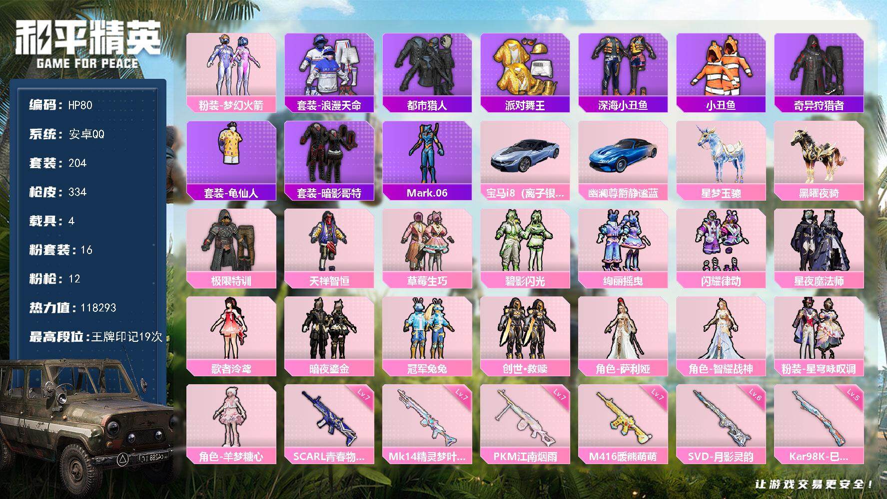 [13869782]安卓 手Q-16粉装-12特效枪-4载具-14粉色飞行器-118293热力值-19王牌印记-204套装-334枪皮