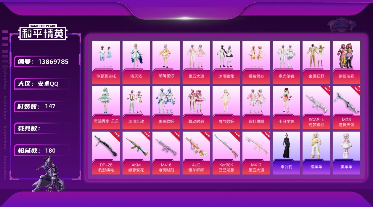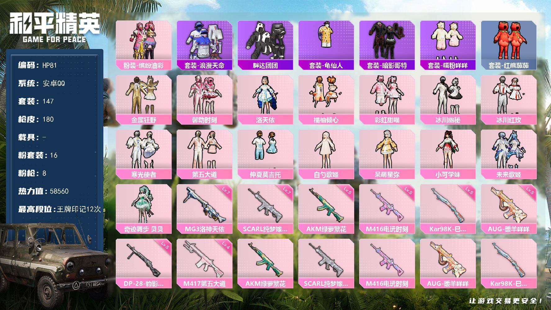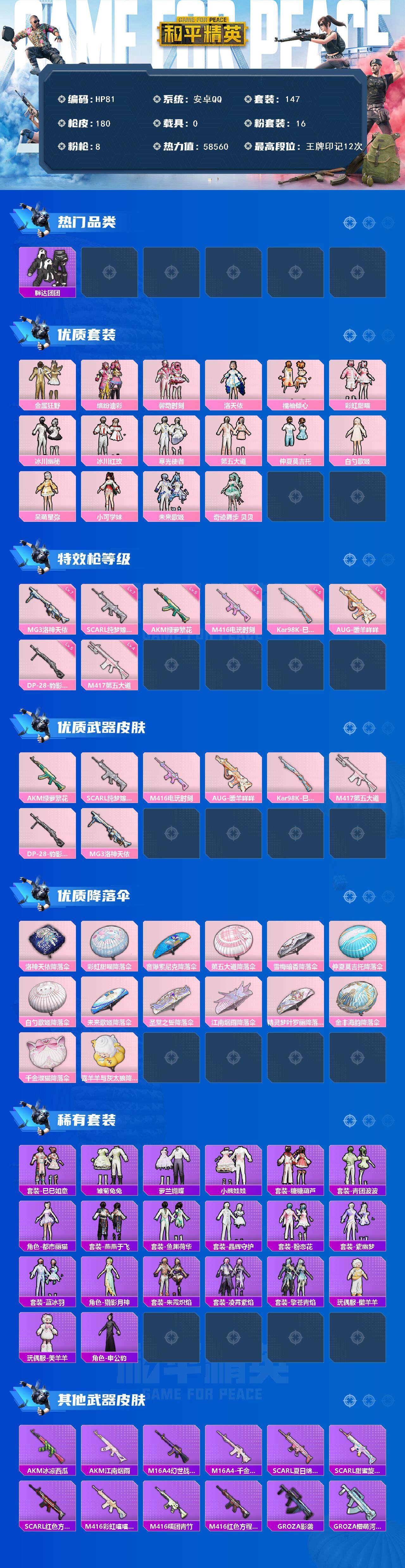 [13869785]安卓 手Q-16粉装-8特效枪-0载具-1粉色飞行器-58560热力值-12王牌印记-147套装-180枪皮 【热门品类】:粉装-缤纷油彩,套装-浪漫天命,套装-胖达团团,套装-龟仙人,套装-暗影哥特,套装-糯粉咩咩,套装-红熊茄茄 【粉色套装】:粉装-金属狂野,粉装-缤纷油彩,粉装-馨动时刻,角色-洛天依,粉装-橘柚倾心,粉装-彩虹甜喵,粉装-冰川幽秘,粉装-冰川红玫,粉装-寒光使者,粉装-第五大道,粉装-仲夏莫吉托,角色-白勺歌姬,角色-呆萌星弥,角色-小可学妹,粉装-未来歌姬,角色-奇迹舞步 贝贝 【粉色枪皮等级】:AKM-绿萝繁花(五级),SCAR-L-纯梦嫁纱(七级),M416-电玩时刻(五级),AUG-暖羊咩咩(五级),Kar98K-巳巳如意(五级),M417-第五大道(四级),DP-28-豹影疾电(五级),MG3-洛神天依(七级) 【粉色枪皮】:AKM-绿萝繁花,SCAR-L-纯梦嫁纱,M416-电玩时刻,AUG-暖羊咩咩,Kar98K-巳巳如意,M417-第五大道,DP-28-豹影疾电,MG3-洛神天依 【粉色降落伞】:洛神天依降落伞,彩虹甜喵降落伞,音爆索尼克降落伞,第五大道降落伞,雪梅暗香降落伞,仲夏莫吉托降落伞,白勺歌姬降落伞,未来歌姬降落伞,圣堂之誓降落伞,江南烟雨降落伞,精灵梦叶罗丽降落伞,金丰海韵降落伞,千金淑猫降落伞,喜羊羊与灰太狼降落伞 【稀有套装】:套装-龟仙人,套装-巳巳如意,套装-雏菊兔兔,套装-萝兰蝴蝶,套装-小熊娃娃,套装-糖糖葫芦,套装-青团波波,角色-都市丽猫,套装-燕燕于飞,套装-鱼渊荷华,套装-晶辉守护,套装-粉恋花,套装-紫幽梦,套装-蓝冰羽,角色-猎影月神,套装-朱霞炽焰,套装-凌霄紫焰,套装-擎苍青焰,玩偶服-懒羊羊,玩偶服-美羊羊,角色-申公豹 【稀有枪皮】:AKM-冰凉西瓜,AKM-江南烟雨,M16A4-幻世战舞者,M16A4-千金淑猫,SCAR-L-夏日绵绵冰,SCAR-L-甜蜜旋律,SCAR-L-红色方程式,M416-彩虹嘻嘻猴,M416-糯团青竹,M416-红色方程式,GROZA-影袭,GROZA-懵萌河马,GROZA-罗小黑,AUG-天降萌叽,AUG-甜蜜菠萝,QBZ-彩虹符号,QBZ-洛神天依,QBZ-神秘黑猫,QBZ-银碳小老虎,M762-天降萌叽,M762-彩虹甜喵,M762-第五大道,Mk