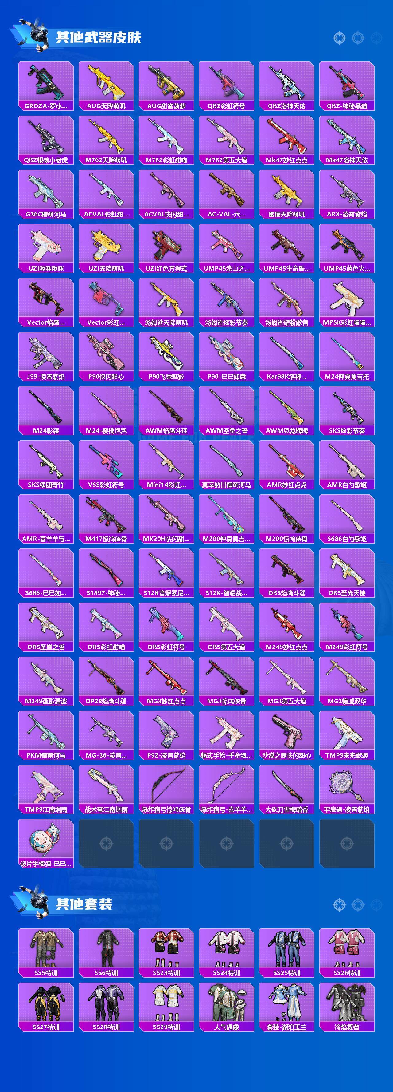 【稀有枪皮】:AKM-冰凉西瓜,AKM-江南烟雨,M16A4-幻世战舞者,M16A4-千金淑猫,SCAR-L-夏日绵绵冰,SCAR-L-甜蜜旋律,SCAR-L-红色方程式,M416-彩虹嘻嘻猴,M416-糯团青竹,M416-红色方程式,GROZA-影袭,GROZA-懵萌河马,GROZA-罗小黑,AUG-天降萌叽,AUG-甜蜜菠萝,QBZ-彩虹符号,QBZ-洛神天依,QBZ-神秘黑猫,QBZ-银碳小老虎,M762-天降萌叽,M762-彩虹甜喵,M762-第五大道,Mk